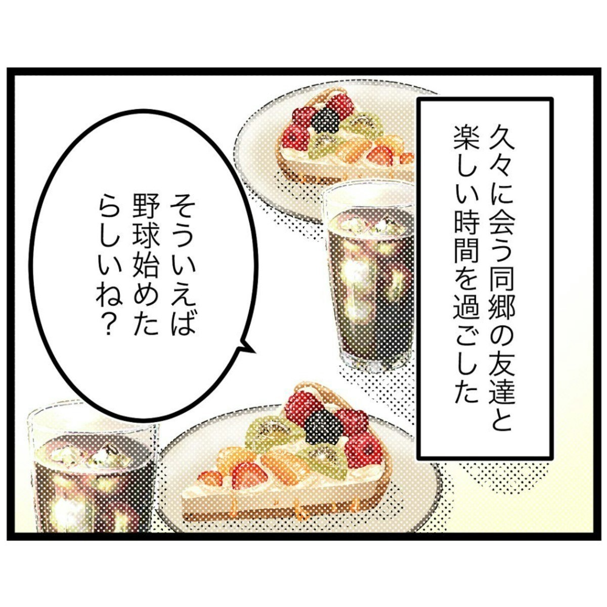 スポ少野球チームの居心地の悪さに疲れていたもっつんさんに、同郷の友達から連絡がありました。久々に会うことになり、もっつんさんの気持ちは弾みます。