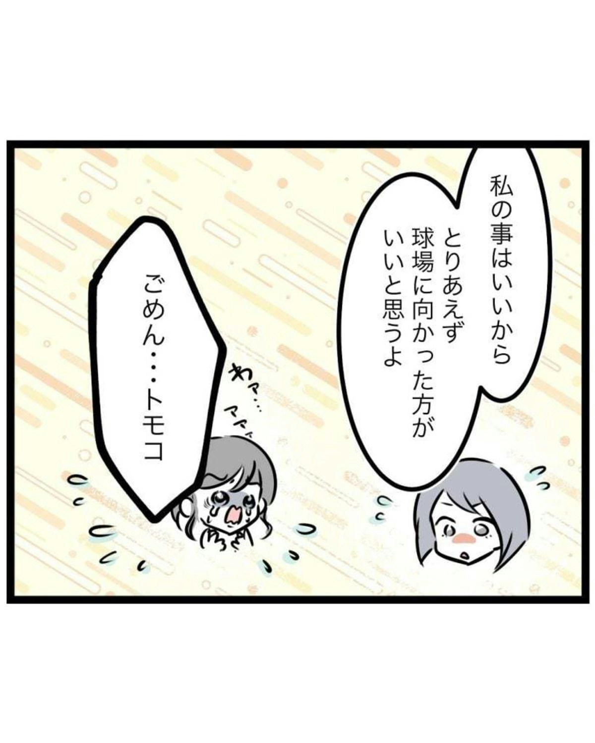 なぜ大切なお茶当番を忘れていたのか、もっつんさんは申し訳なさと自己嫌悪でいっぱいになってしまいました。慌ただしく友達に別れを告げ、球場へ出発です。