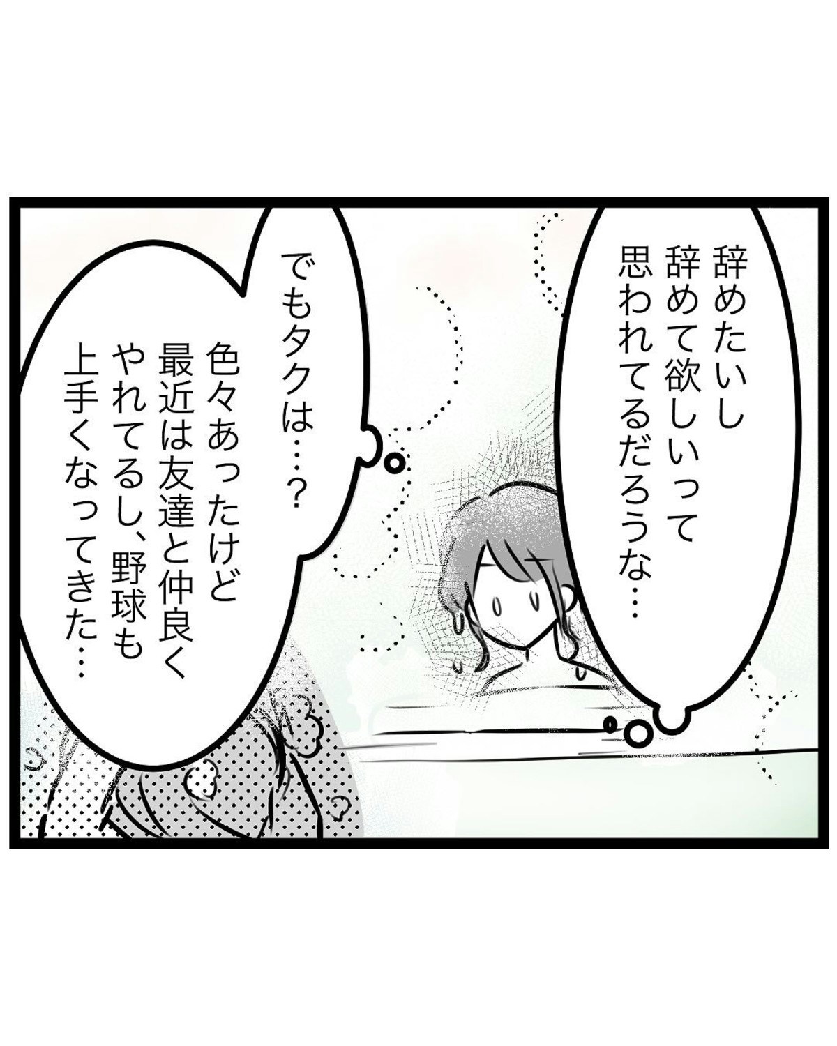 「やめたいし、やめてほしいって思われているだろうな」とマイナスの考えが溢れます。それでも、息子・タクはチームで野球を楽しんでいます。
