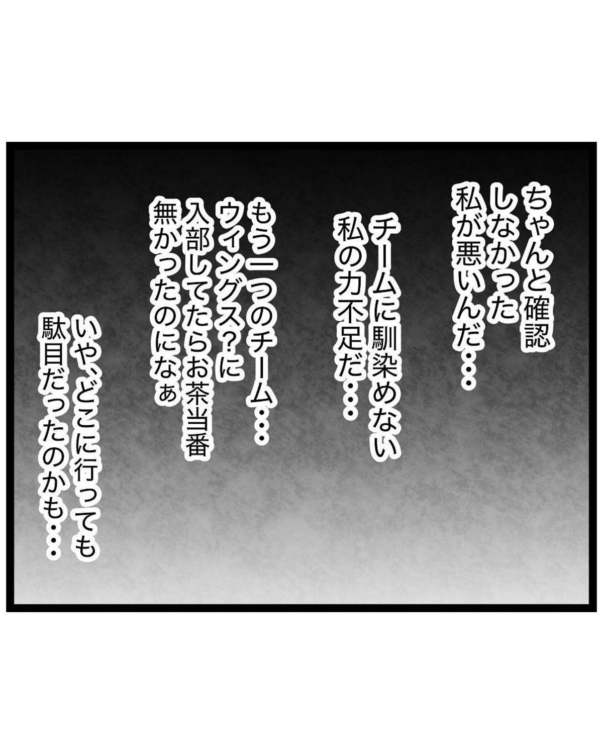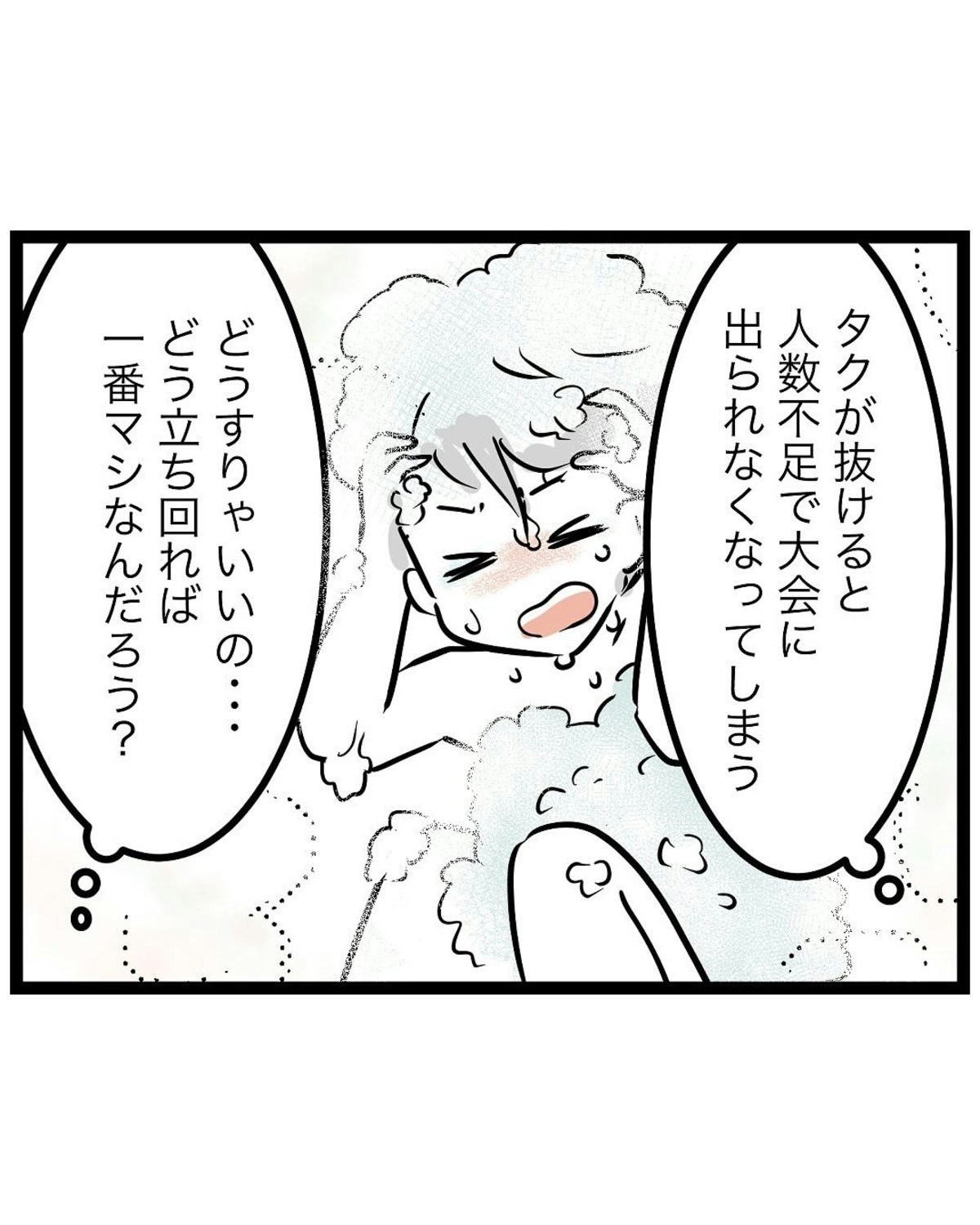 チームになじめない自分は疎まれているだろうけど、今やめたら人数不足で試合に出られなくなってしまいます。やめるのもやめないのも迷惑になってしまう状況に、もっつんさんは思い悩みます。
