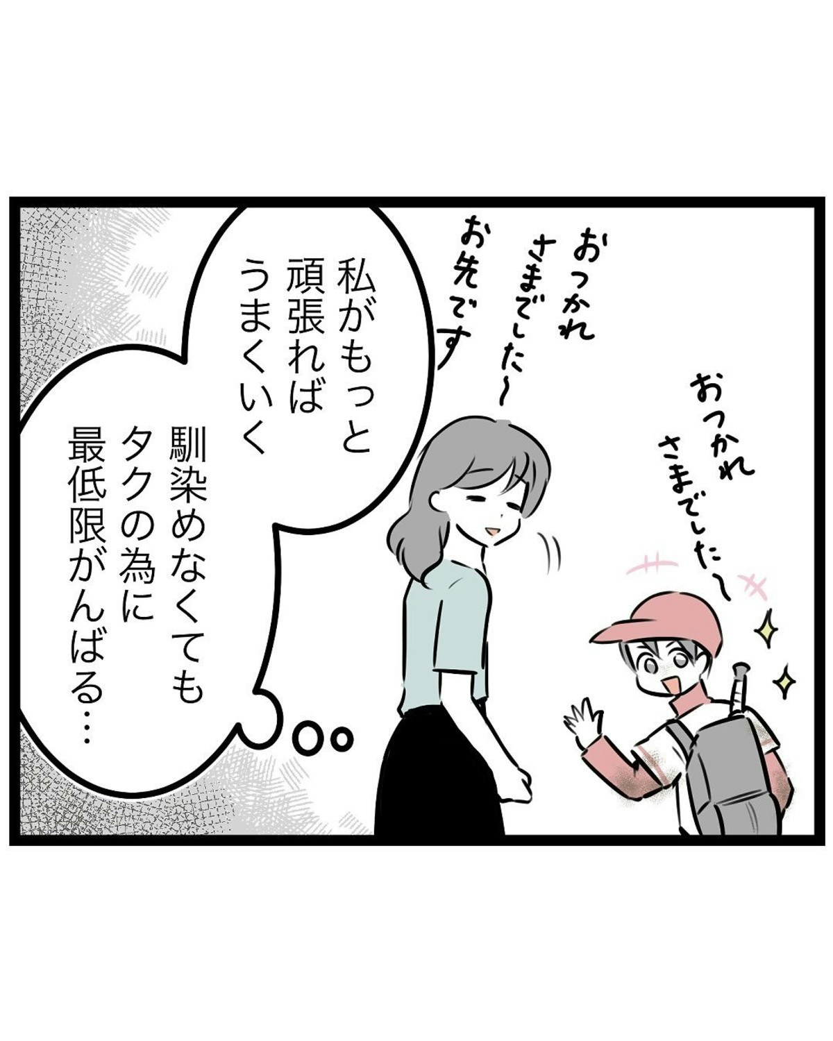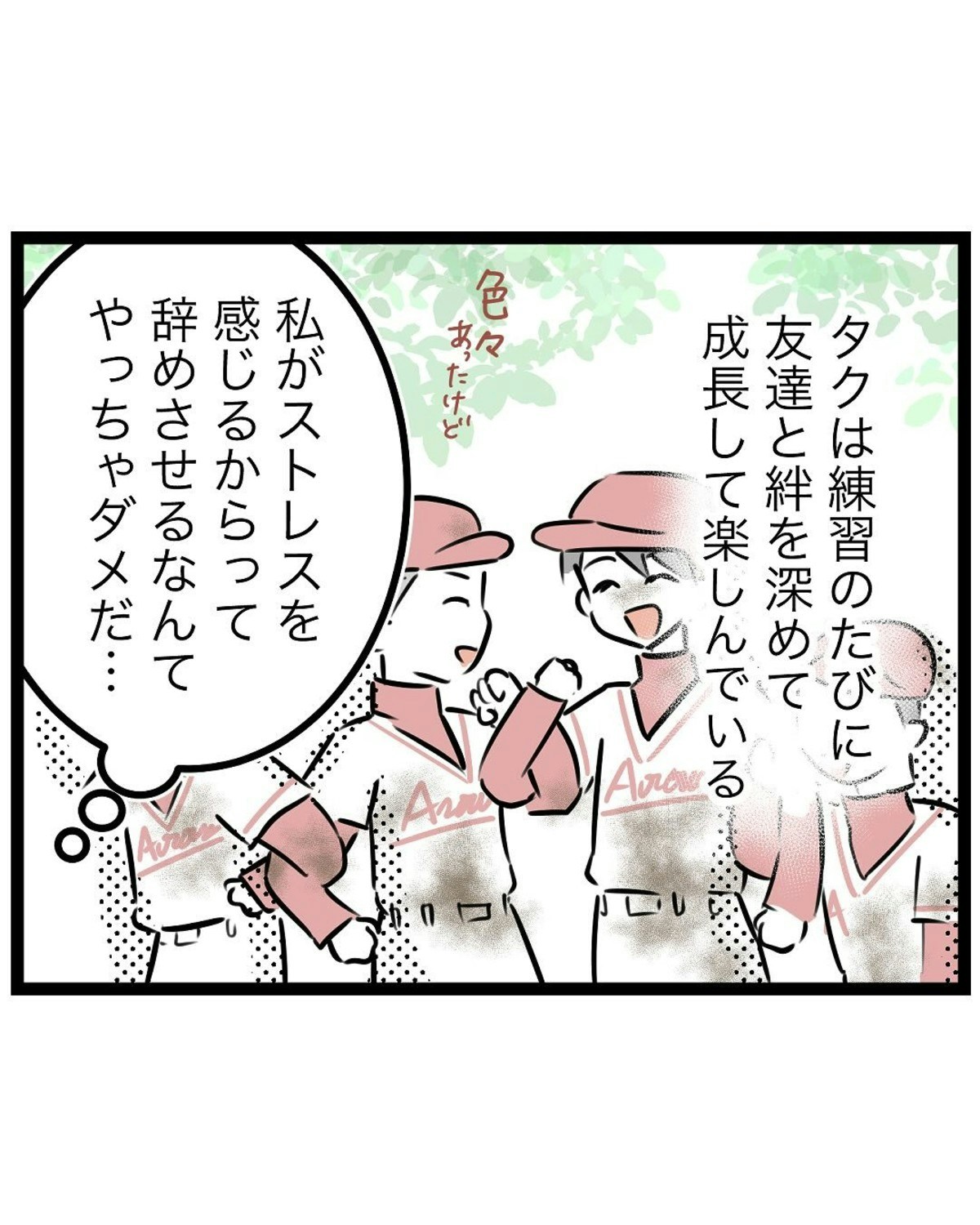 お茶当番をすっかり忘れてしまい、チームからの連絡で慌てて球場に駆けつけたもっつんさん。謝罪はしたものの、保護者たちとの関係はさらにギクシャクし、孤独感が募っていきます。辞めたい気持ちはあるけれど、野球を楽しむ息子の姿を思うと簡単には決断できず、もっつんさんは苦しんでいました。
