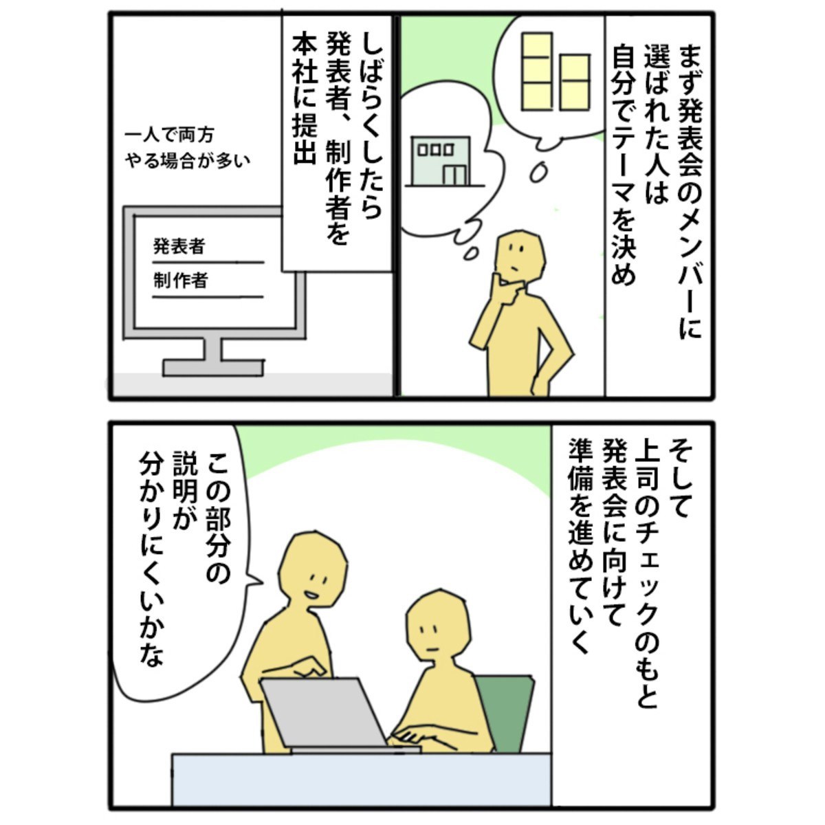 発表会までの進め方は、支社によってそれぞれ異なっているようです。