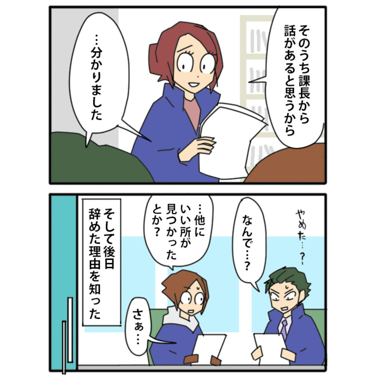 Tさんの突然の退職に、カモちもさんと同僚もおどろきをかくせません。そのうち課長から話があると、その場では説明をさけました。そして、やめた理由があきらかになります。
