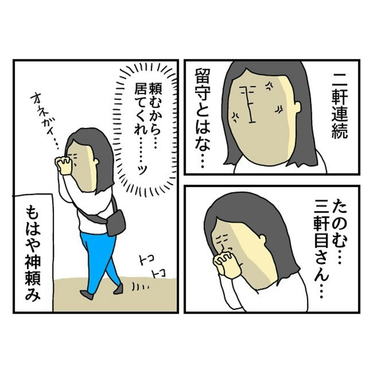 前もって伝えていた期日に、2軒とも留守…という結果に落ち込む つっちさん…。最後の家に向かいますが、もはや神頼みです。