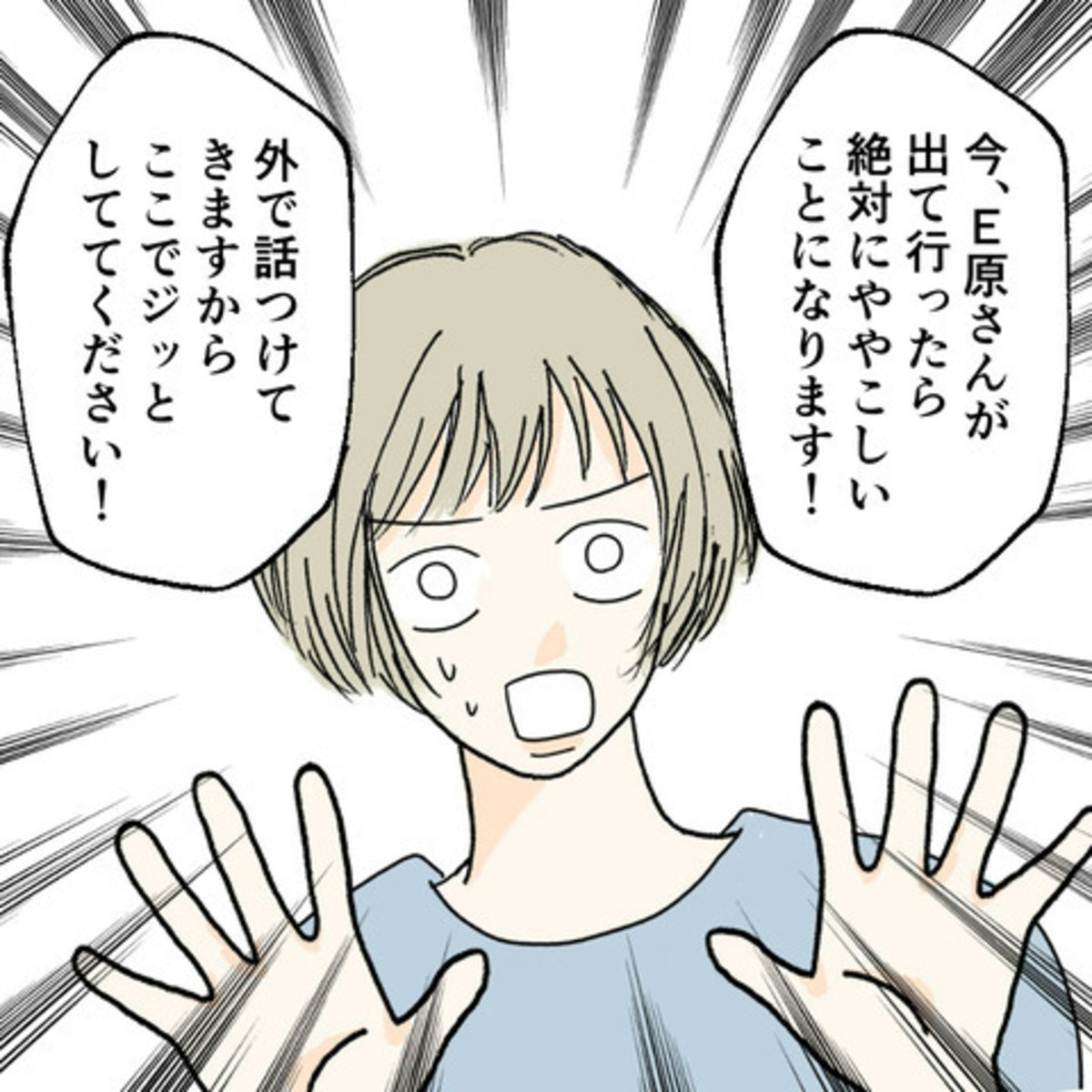 E原さんは自分がいてはいけないと察したのか「帰ります」と言いました。しかし、ここでE原さんがM生に会ってしまうと更にややこしくなると思い、S葉さんは自分から動くことにします。