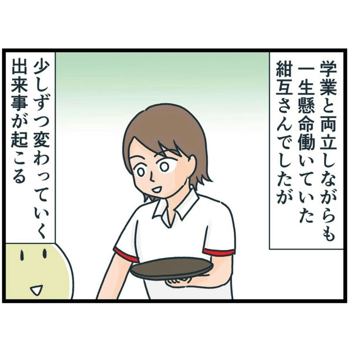 ナエクマさんは飲食店で働いており、そこにはいろいろな人が一緒に働いています。ある時、夜間高校に通う紺互さんという女子高生がバイトとして入ってきました。4年で高校を卒業予定の紺互さんですが、3年生までにほとんどの単位を取ったとのことで、バイトで意欲的に働いています。