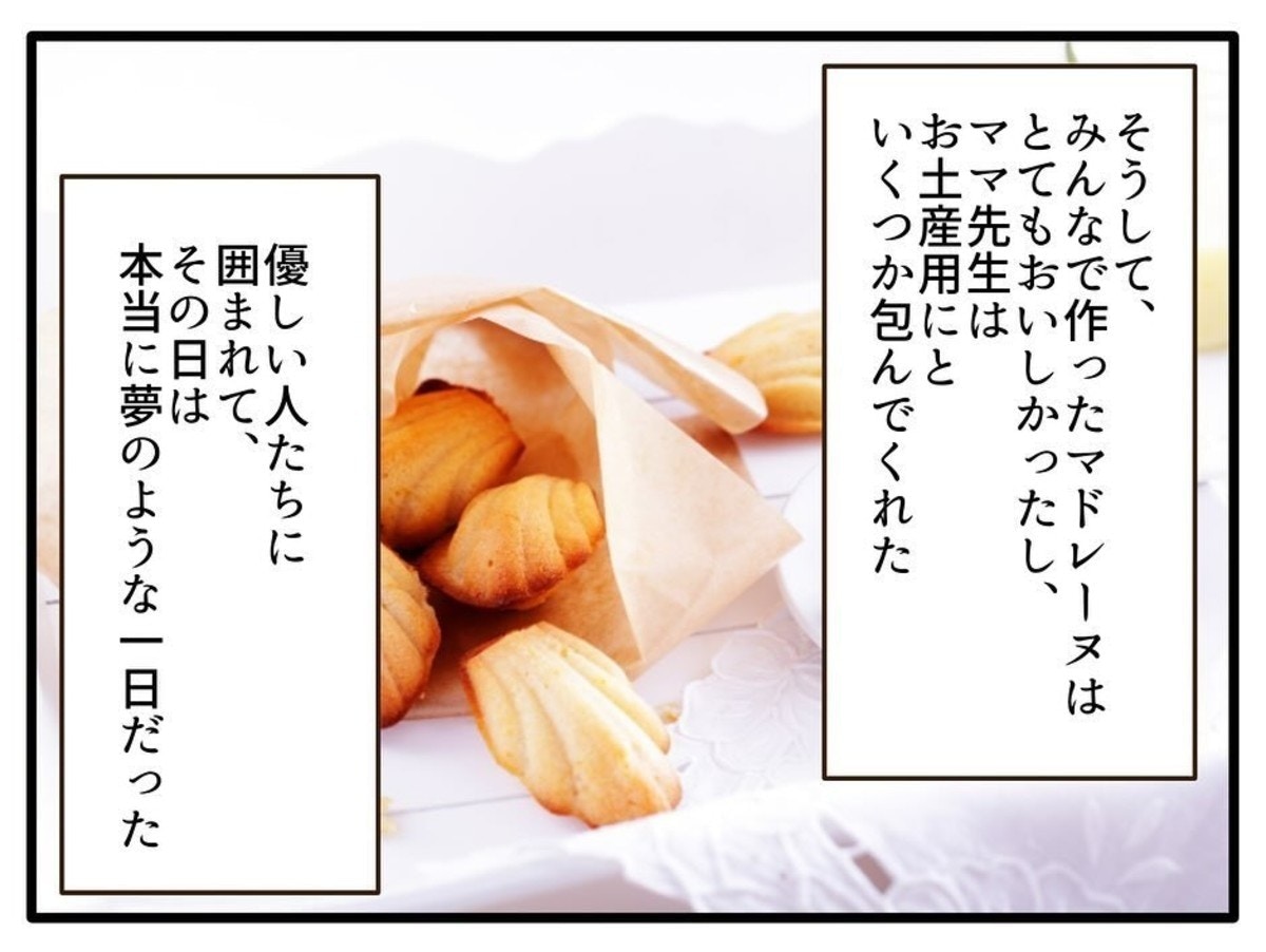 パパ先生の塾で、ママ先生や他の塾生と作ったマドレーヌは、作ったお菓子だけでなく、その過程の時間がしおりにとってとても楽しく、心がホカホカする時間だったに違いありません。しかし、気持ちがウキウキしたまま家に帰ったしおりを待ち受けていたのは、両親からの冷たい仕打ちでした…。