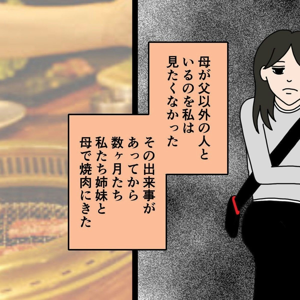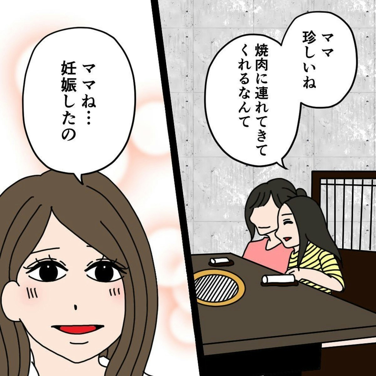 生みの母が実の父以外の男性といることに、嫌悪感を抱いたこだころ.さん。その数か月後、焼き肉に連れて行ってくれた母から「ママね…妊娠したの」と報告があり、赤ちゃんが生まれるとあまり会えなくなることを知らされるのでした。