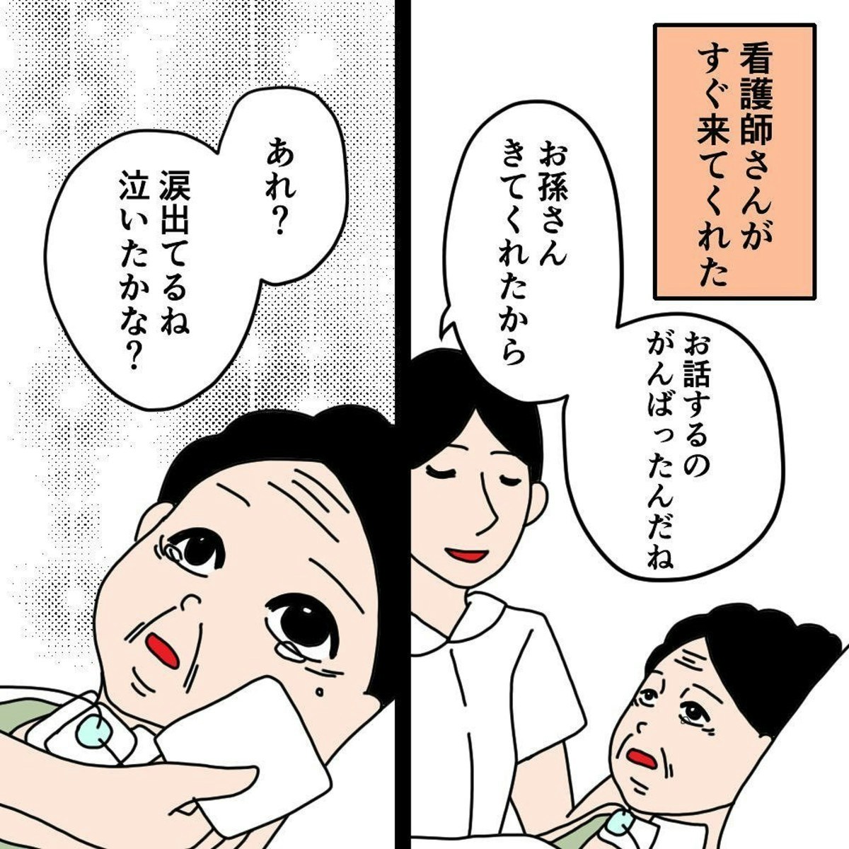 急に「あぁーーあ」と声を出した祖母に驚きを隠せないこだころ.さん。すぐに看護師さんが来てくれ、祖母の涙を拭いてくれるのでした。