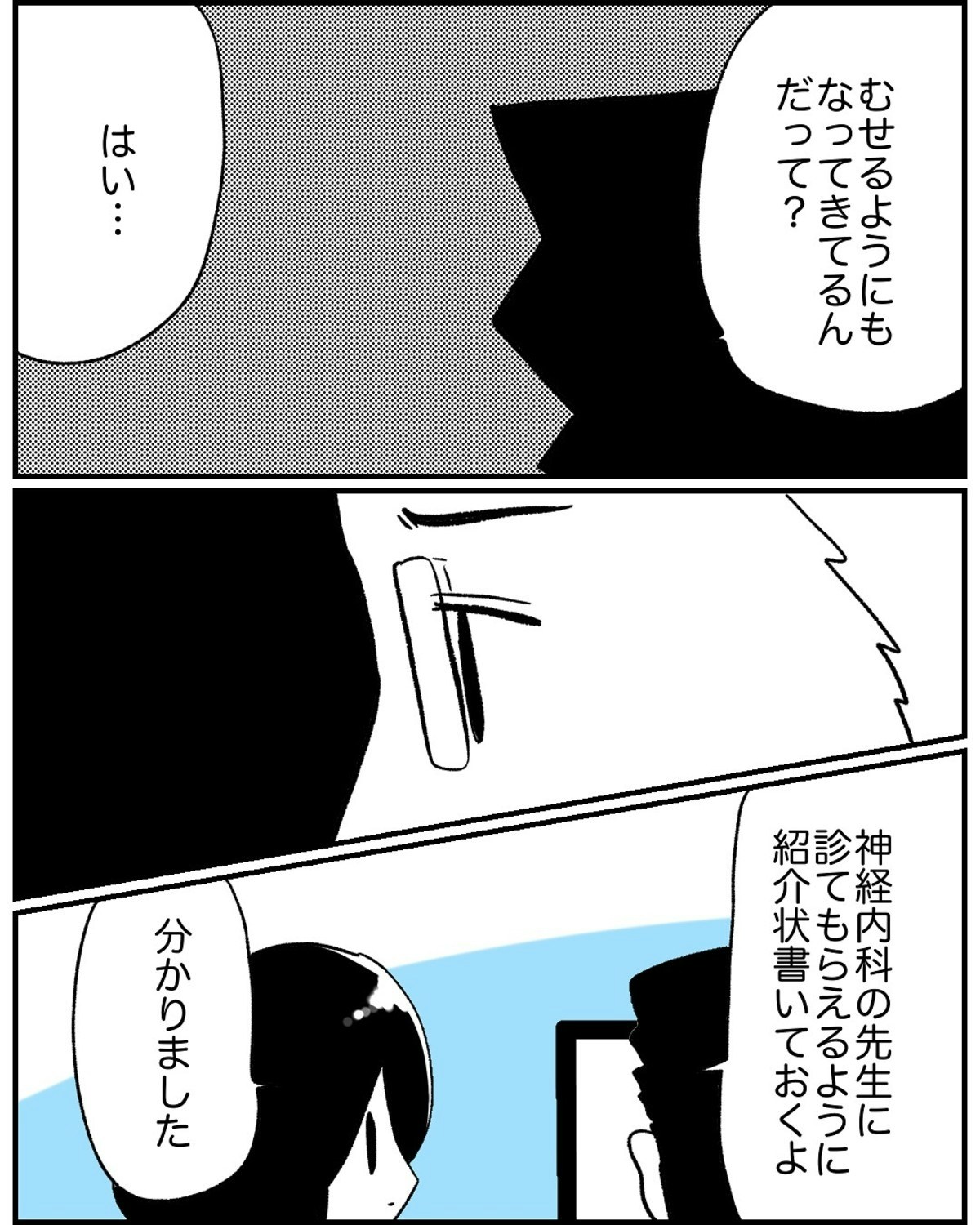 体の異変に気づいてから1年。先生から告げられた病名は難病・ALSでした。今までの症状を照らし合わせ納得する反面、ALSという病気の恐ろしさを知っている花さんは、動機と凄まじい恐怖に襲われるのでした。