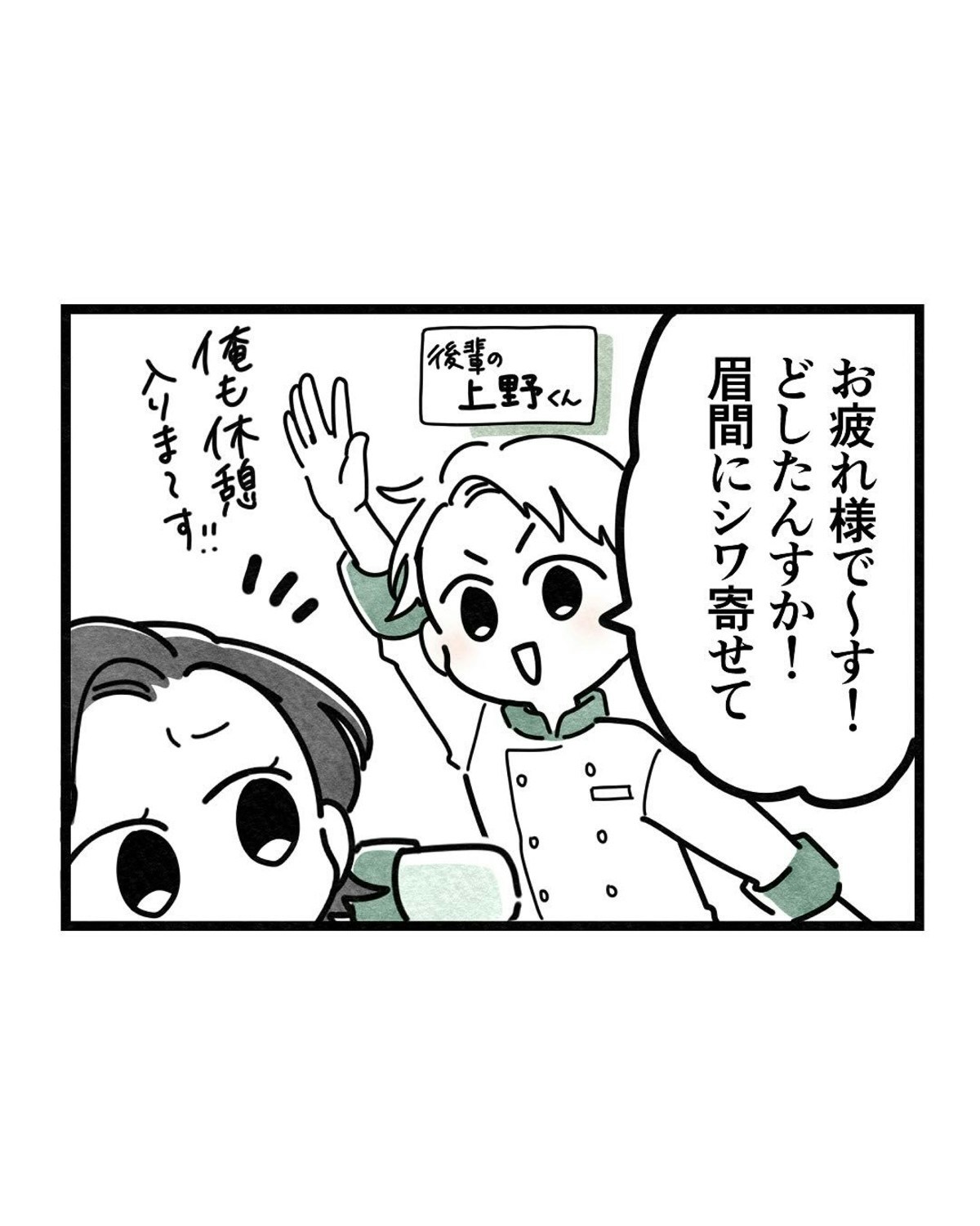 後輩の上野君に眉間にしわ寄っていると言われるさえさん。悩みすぎて顔に出てしまっていたようです。