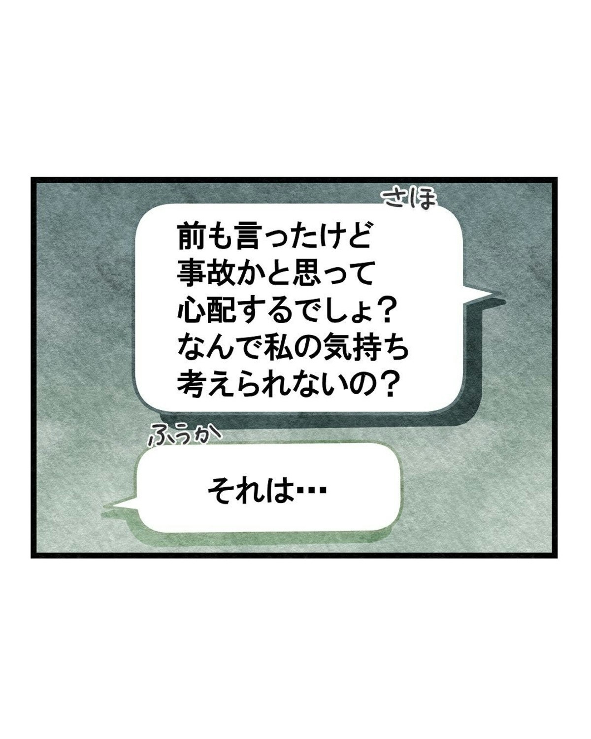 メッセージアプリで、ふうかさんから謝罪のメッセージを受け取ります。許してあげる気は全く無いさほさん。どうして連絡もくれないのか疑問を投げかけました。