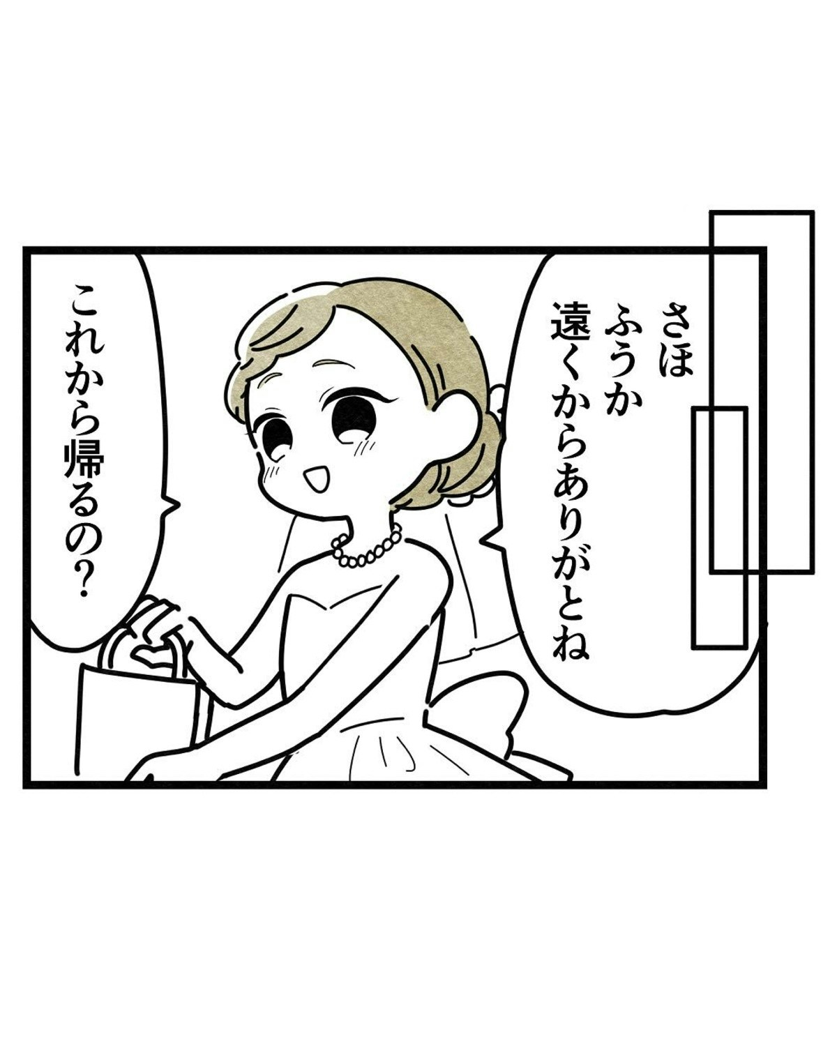友人みゆきさんの結婚式が終わり、お見送りを受けるさほさんと、ふうかさん。