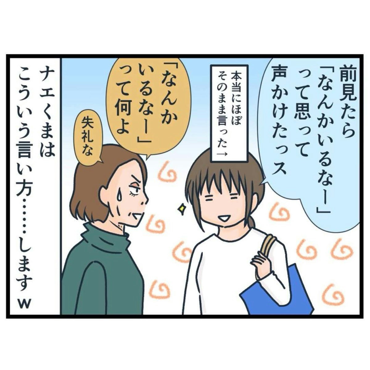 そこにいたので挨拶をしたと素直に告げるナエくまさん、問句さんも「失礼な」と言いながら、悪くは思っていないようです。