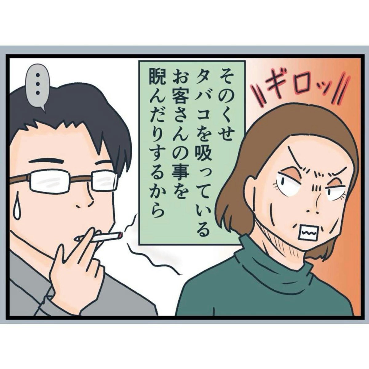 バイトさんから、禁煙席を勧められるも「この席が気に入っている」と断り、挙げ句バイトさんの態度にいちゃもんを付け始め、「店長を読んできてちょうだい!」と言い始めます。