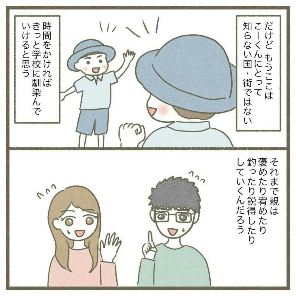ところが出発直前、到着日がお父さんの出張と重なっていることが判明。現地に着いてもすぐには家族がそろわず、みゅこさんが一人でこーくんを保育園に連れて行くことになります。日本と違う保育環境に戸惑い、登園を嫌がるこーくん。みゅこさん自身も不安を感じながらのスタートでしたが、少しずつこーくんも園に慣れ、笑顔が戻っていきました。