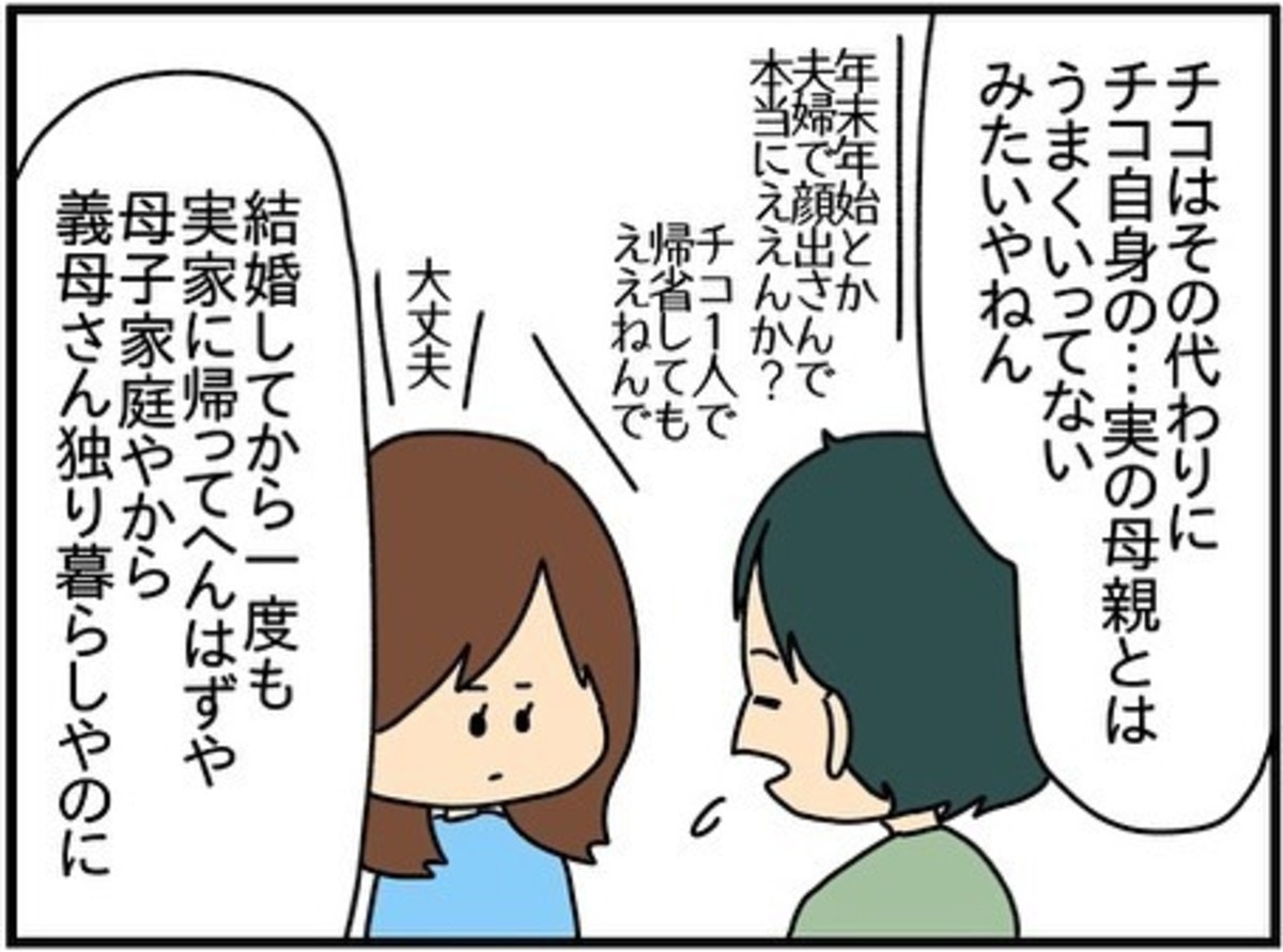 義母の何気ない一言にも敏感に応じ、手土産まで欠かさないチコちゃんの姿に、夫の両親も娘のように可愛がっていました。一方で、自分の母親とは結婚後一度も会っておらず、帰省もしない様子です。一体何があったのでしょうか。