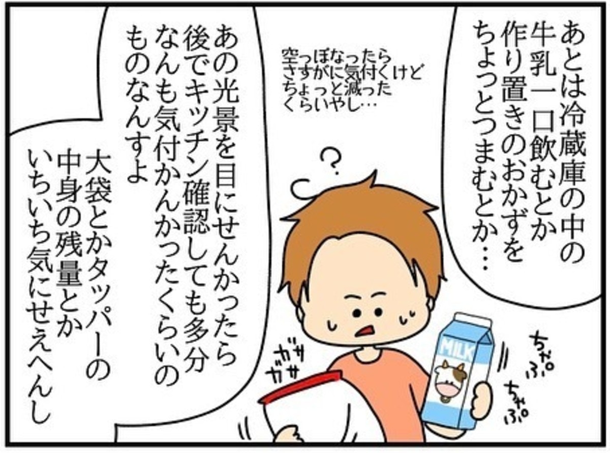 大谷さんが見たのは、チコちゃんがキッチンの戸棚や冷蔵庫から食べ物をポケットや口に詰め込む姿でした。手を付けたのは、安いお菓子や牛乳一口、作り置きのおかずのほんの一部だけ。その話を聞いた夫はひたすら謝るしかありませんでした。