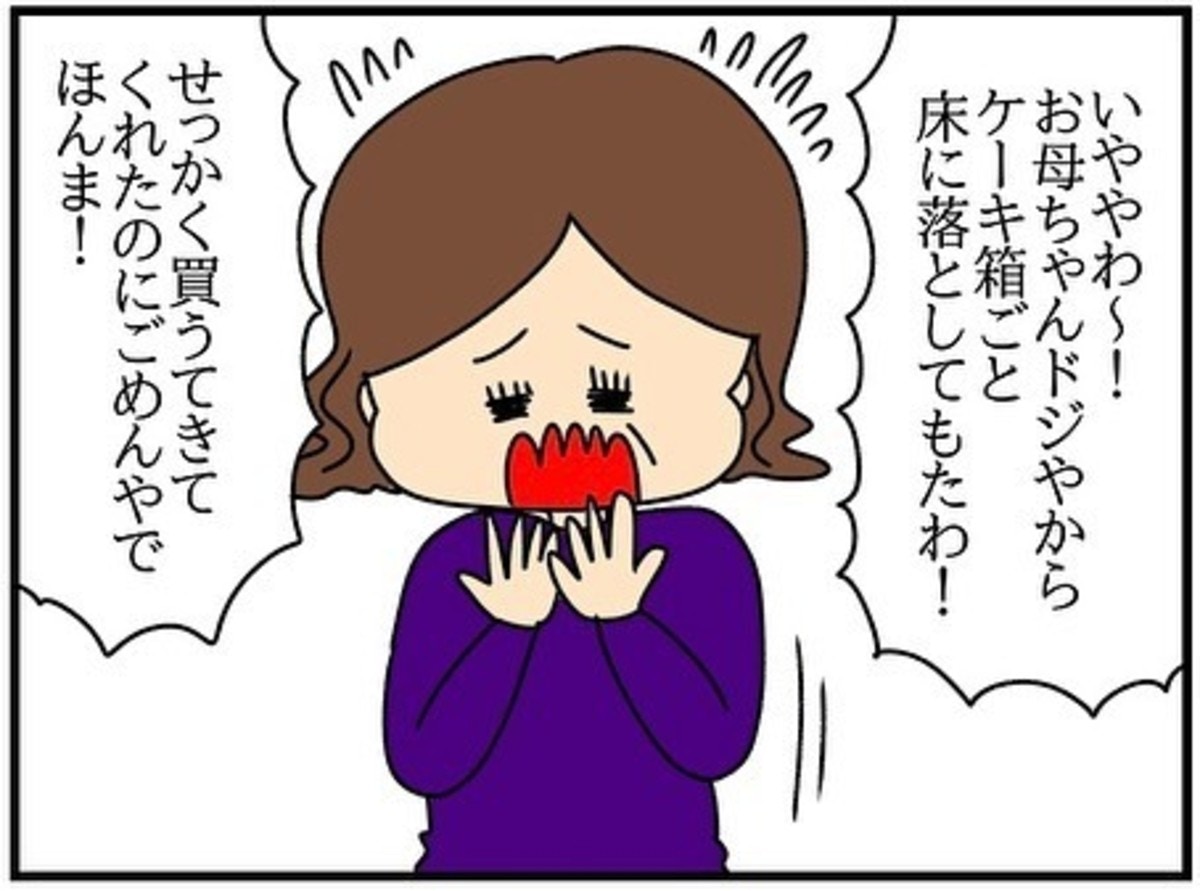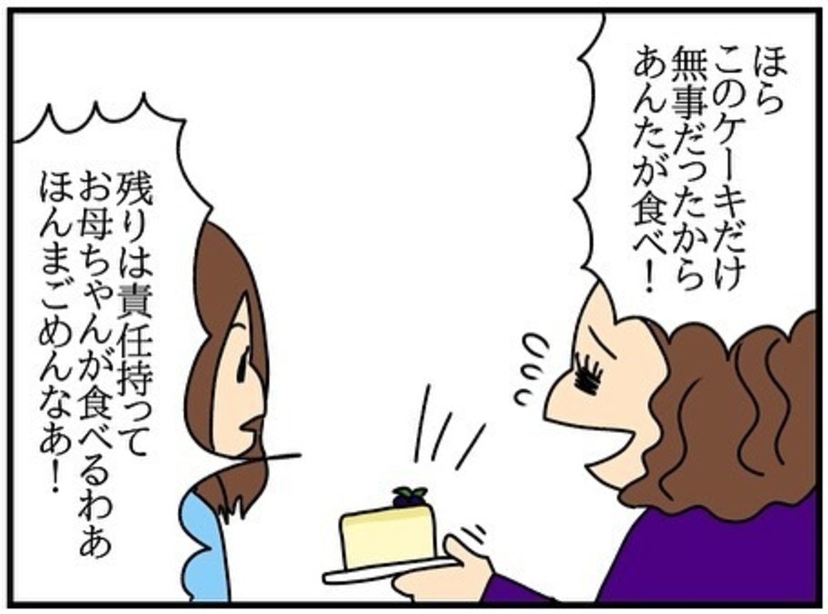 チコちゃんがプレゼントしたケーキを母が落としてしまい、無事だったケーキをチコちゃんに渡してきました。