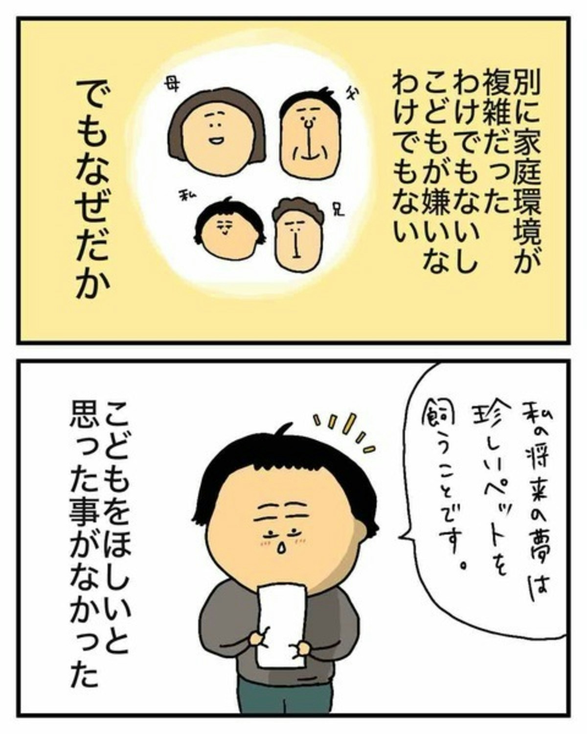 小学生だったエクボさんは、友達が「将来はお母さんになりたい」と話すのを聞いて、どこかピンときませんでした。自分は一度も、そう思ったことがなかったからです。そんなエクボさんに、お母さんは「大人になれば気持ちも変わるわよ」とほほ笑んでくれました。