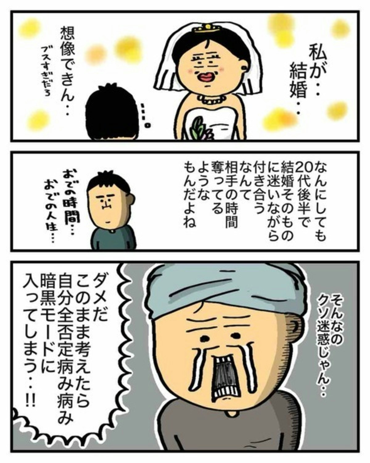 シゲオさんが勇気を出して一緒に住もうと言ってくれたと感じたエクボさんは、自分もちゃんと考えなければと思います。すると結婚を前提にってことか…と思い、深く考えだすと自分全否定病み病み暗黒モードに入ってしまう!と慌てます。