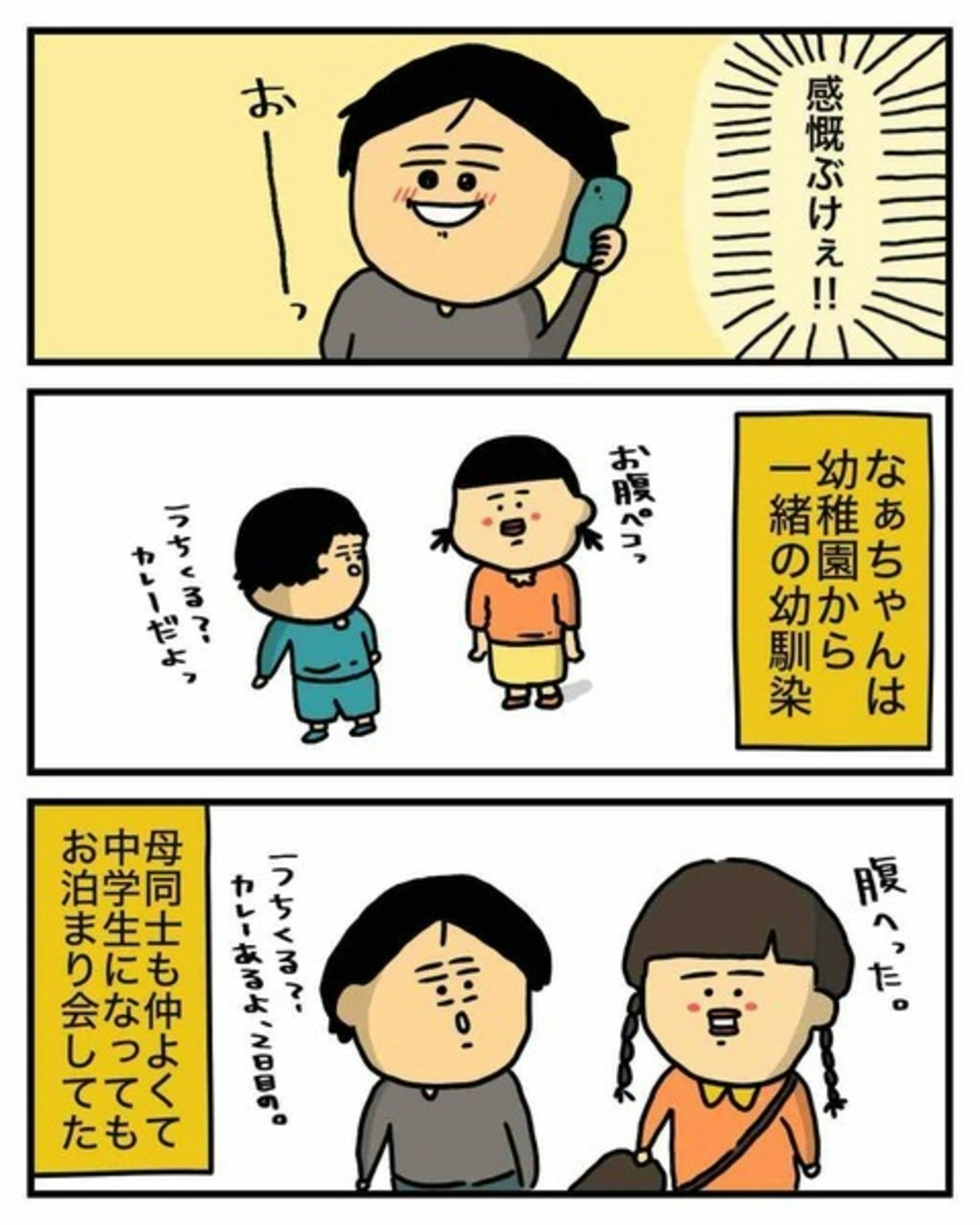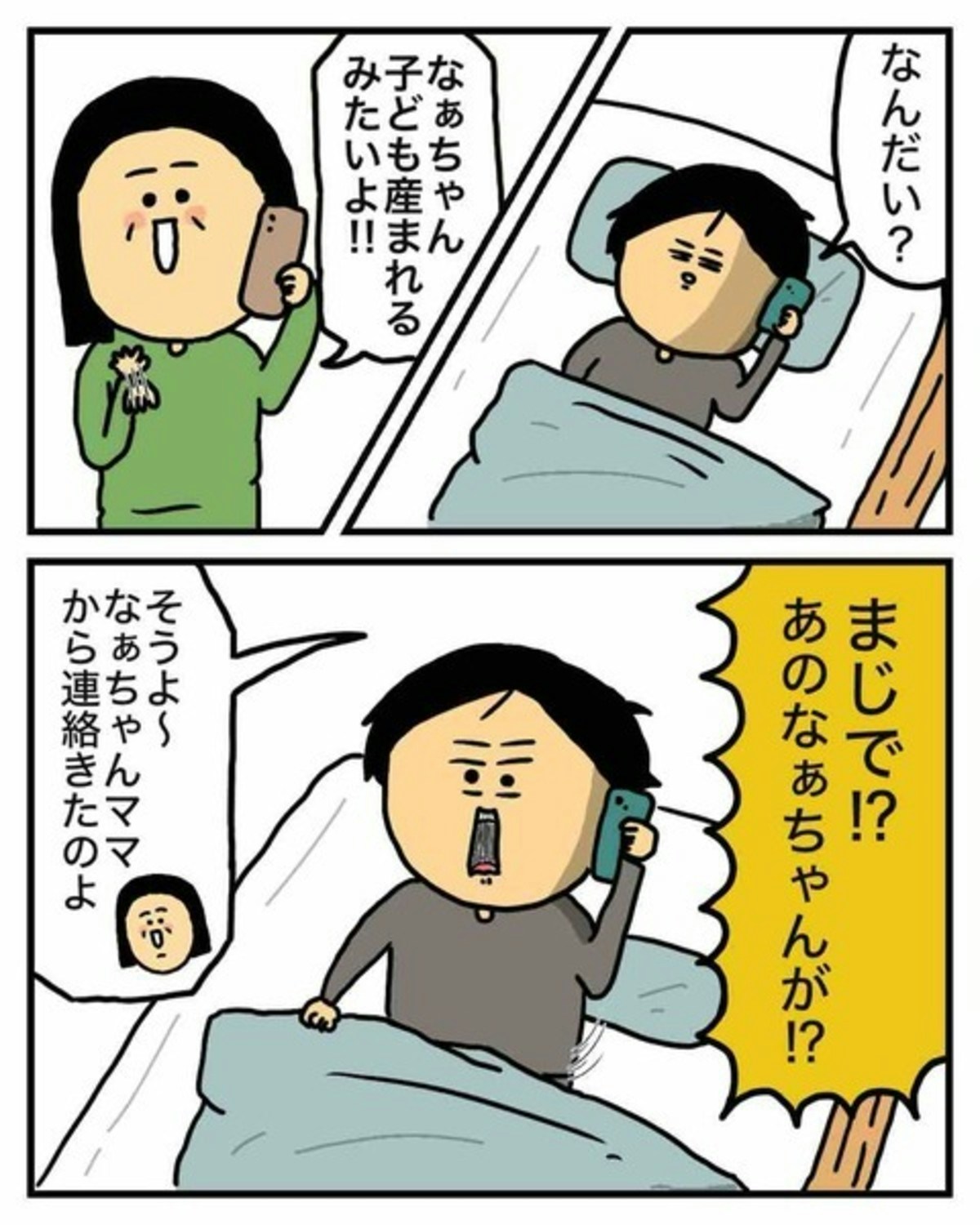 母からの電話はエクボさんの幼馴染なぁちゃんに子どもが産まれる、という情報でした。幼稚園からの幼馴染ですが、深い話はしないドライな関係。