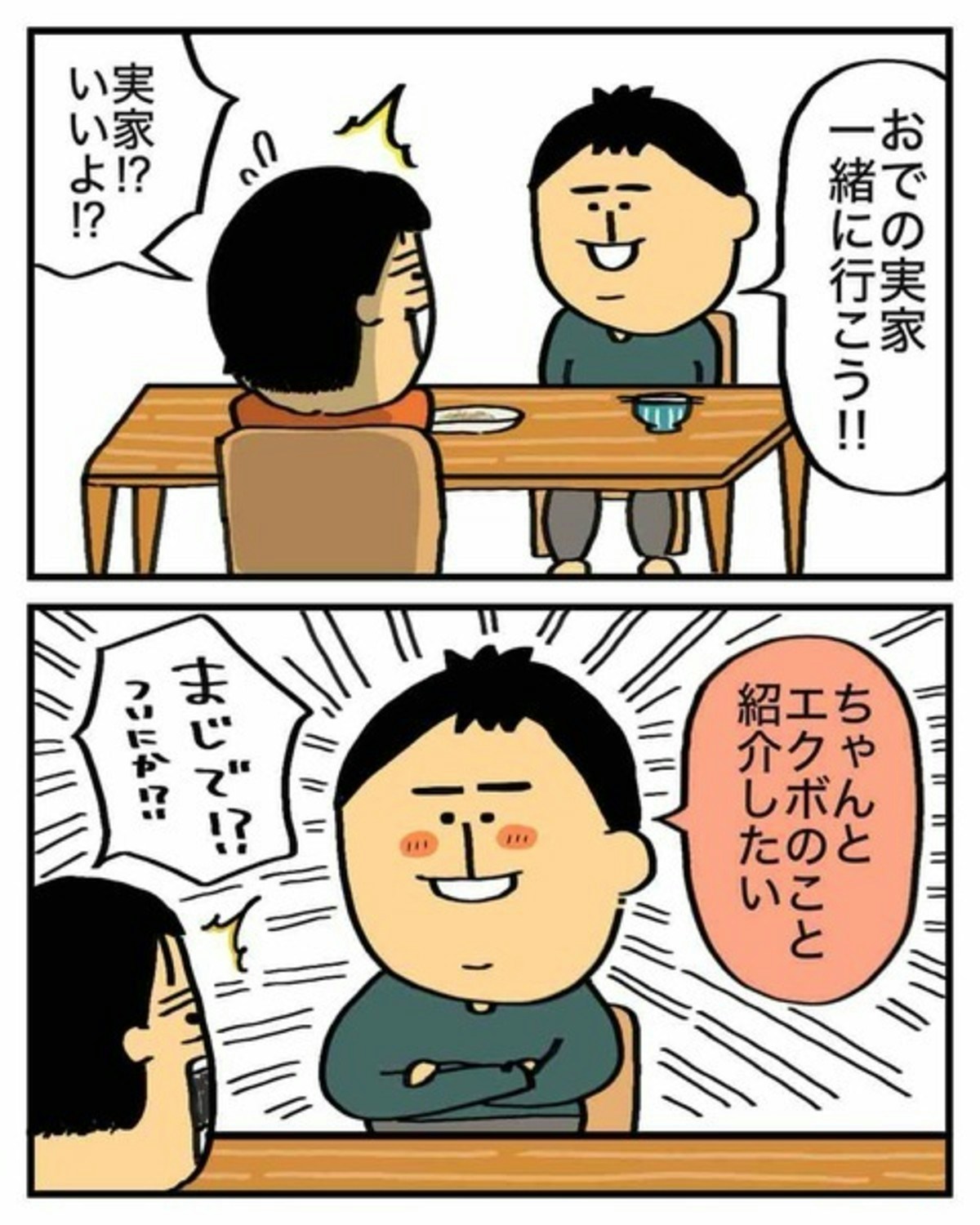 エクボさんとシゲオさんの同棲生活が始まり、ふたりは楽しい日々を過ごしていました。そんなある日、シゲオさんに「実家に行こう、ちゃんとエクボのこと紹介したい」と言われ、驚きながらもいいよと答えるエクボさん。