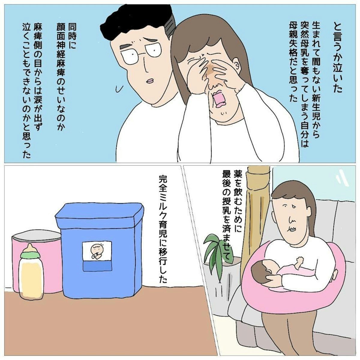 左側の顔面神経麻痺を発症したみうらまるこさんは、治療のために服薬が必要となり、病院から母乳をやめてミルクへ移行するよう指導を受けました。まだ生後2週間の赤ちゃんを育てていた時期だったこともあり、その現実を受け止めるのはとてもつらいことだったようです。