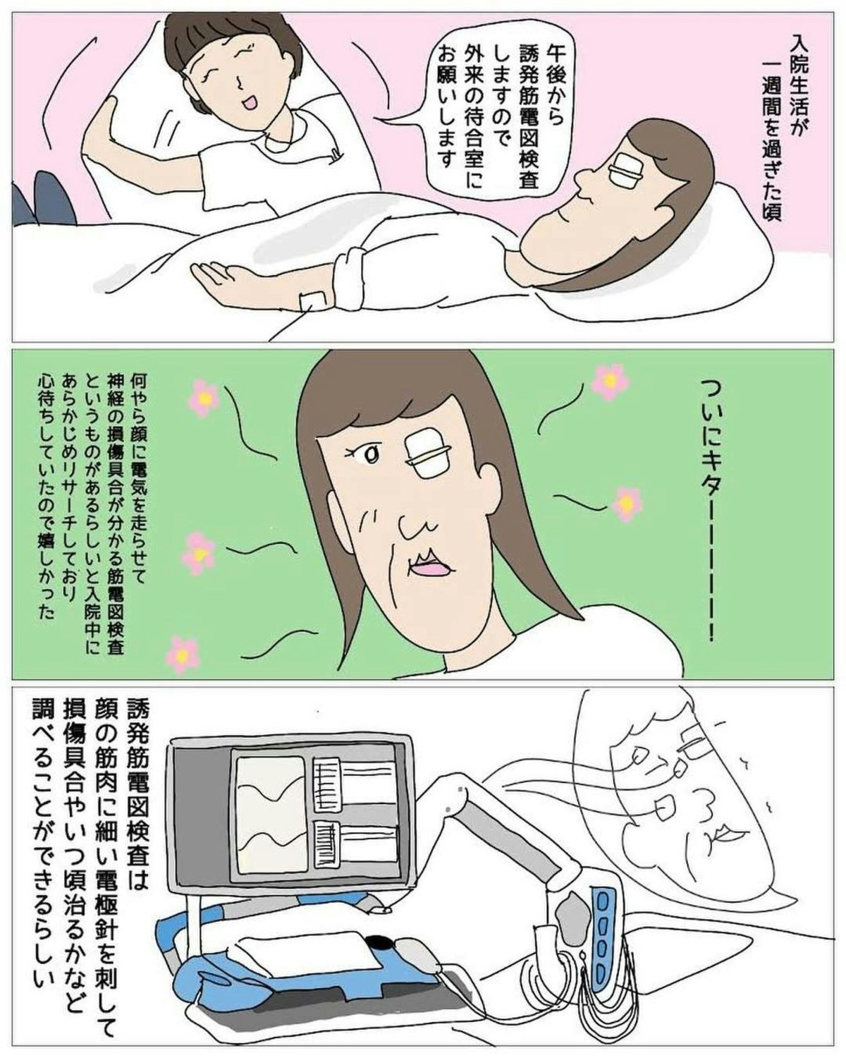 顔面麻痺の治療期間や損傷の度合いを調べるため、誘発筋電図検査を行います。これにより今後の経過が予想しやすくなるのです。