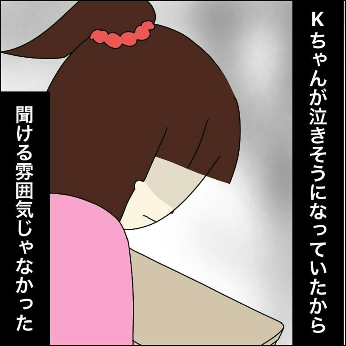お道具箱の中の髪の毛についてすでに知っていたBちゃん。そのBちゃんはこの髪の毛について「Kが自分で切った」と言いました。「なんでそんなことをしたの?」と素直にわきあがる疑問を尋ねられない雰囲気が、Kちゃんの周りには漂っています。
