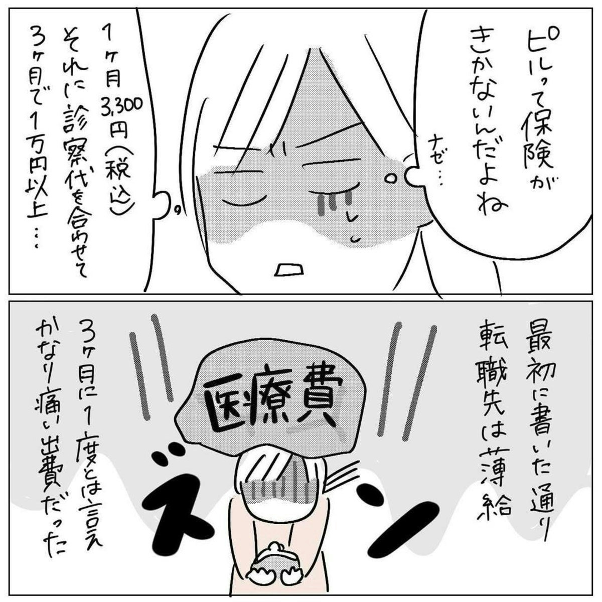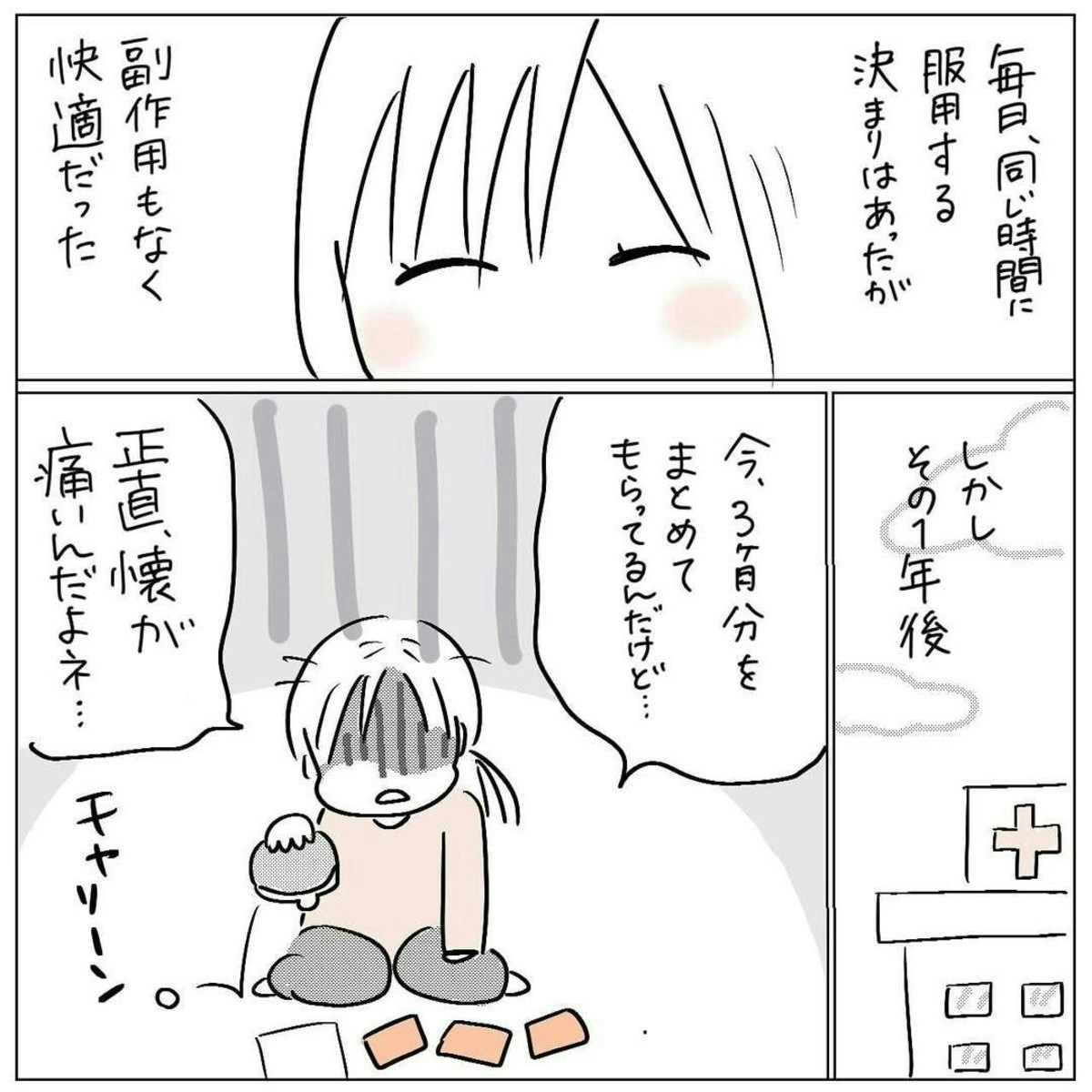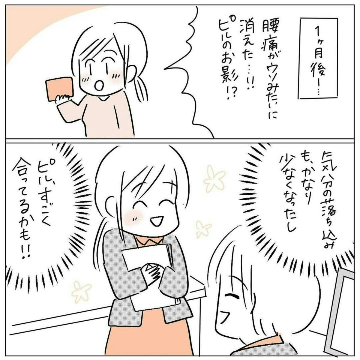 ピルを服用したおかげで、腰痛が改善!さらに、気分の落ち込みも以前ほど激しくはなく、ホッターさんにとって、ピルの服用は合っていたようで、よかったですね。ただ、薬代と診察費で出費がかさんでしまう点はデメリットでした…。