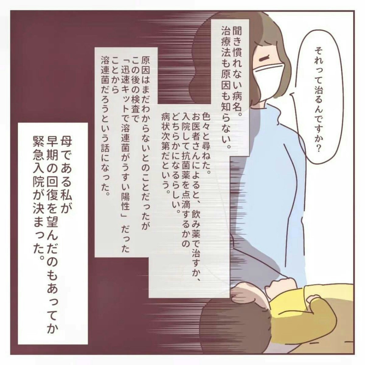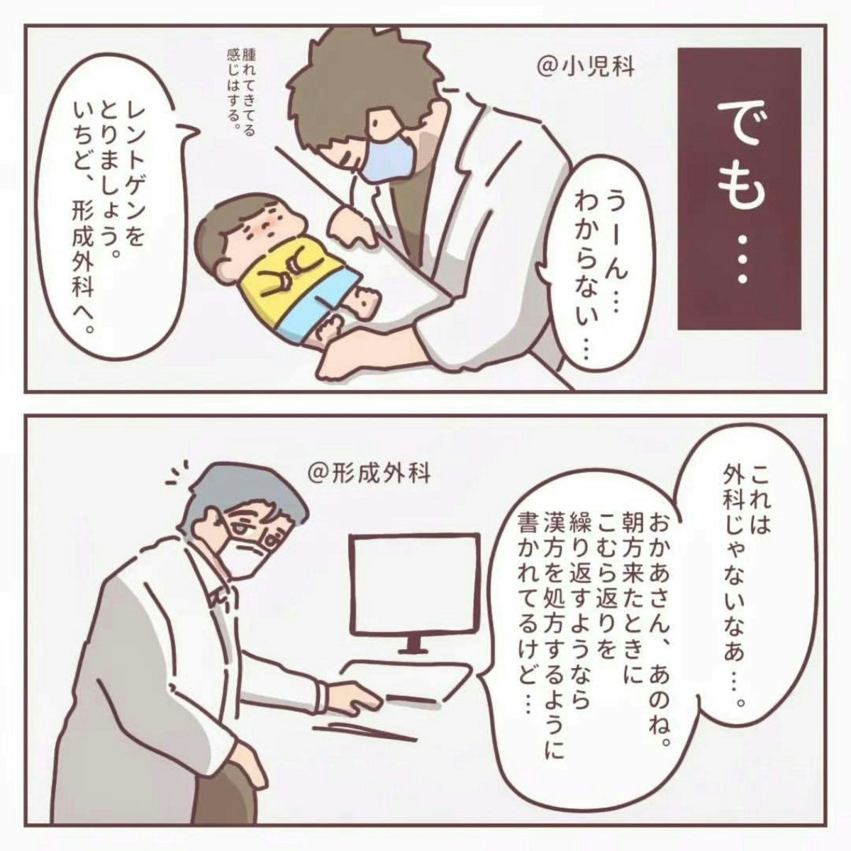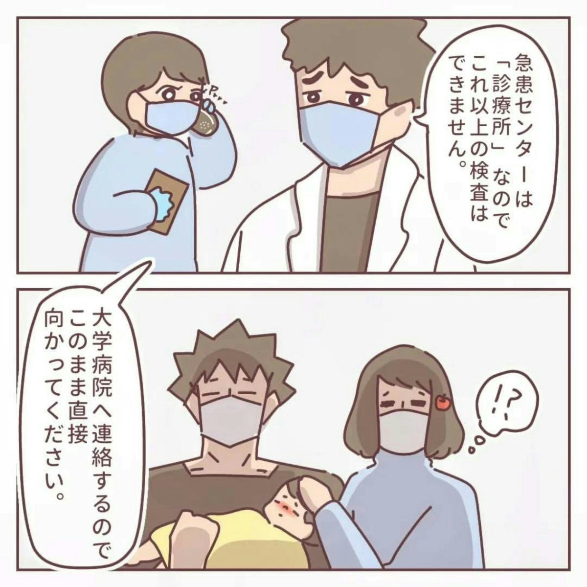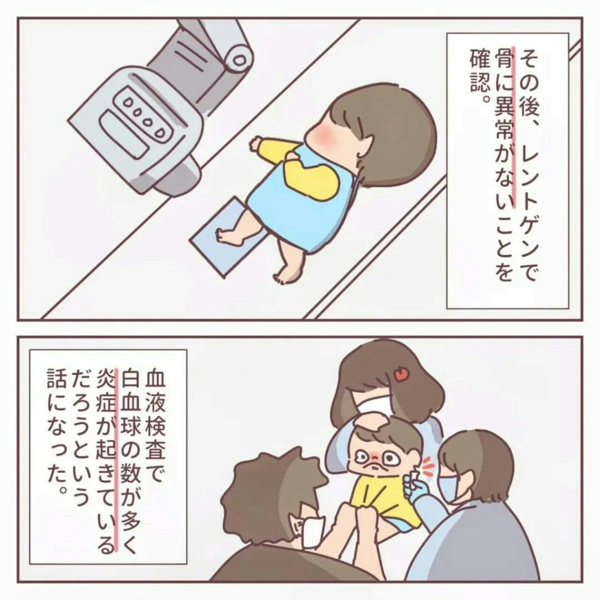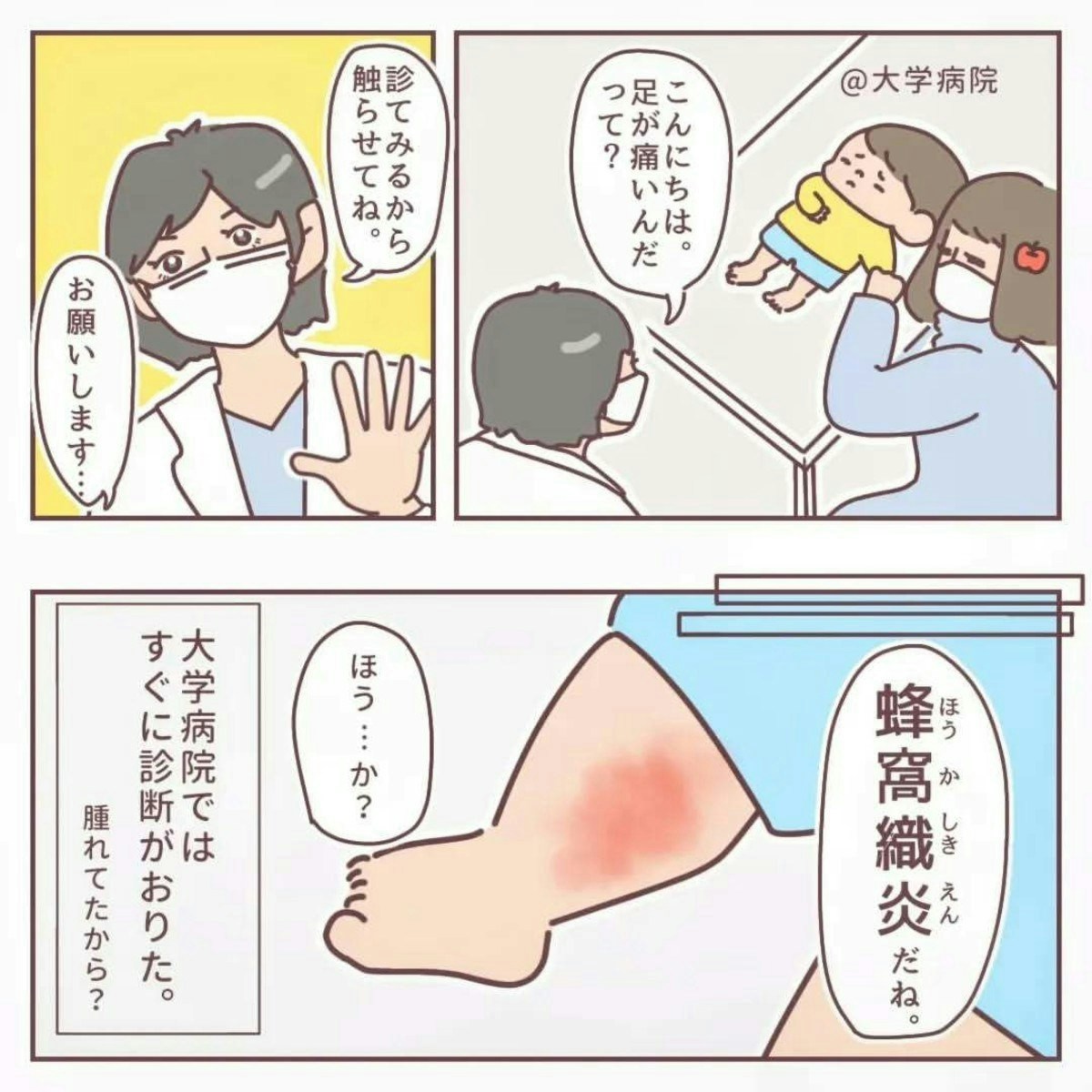 「こむら返り」とはどうしても思えなかった、りんごさん。母の直感を必死に医師へ訴えます。すると、検査の結果、「炎症が起きている」という話になり、大学病院を紹介されます。