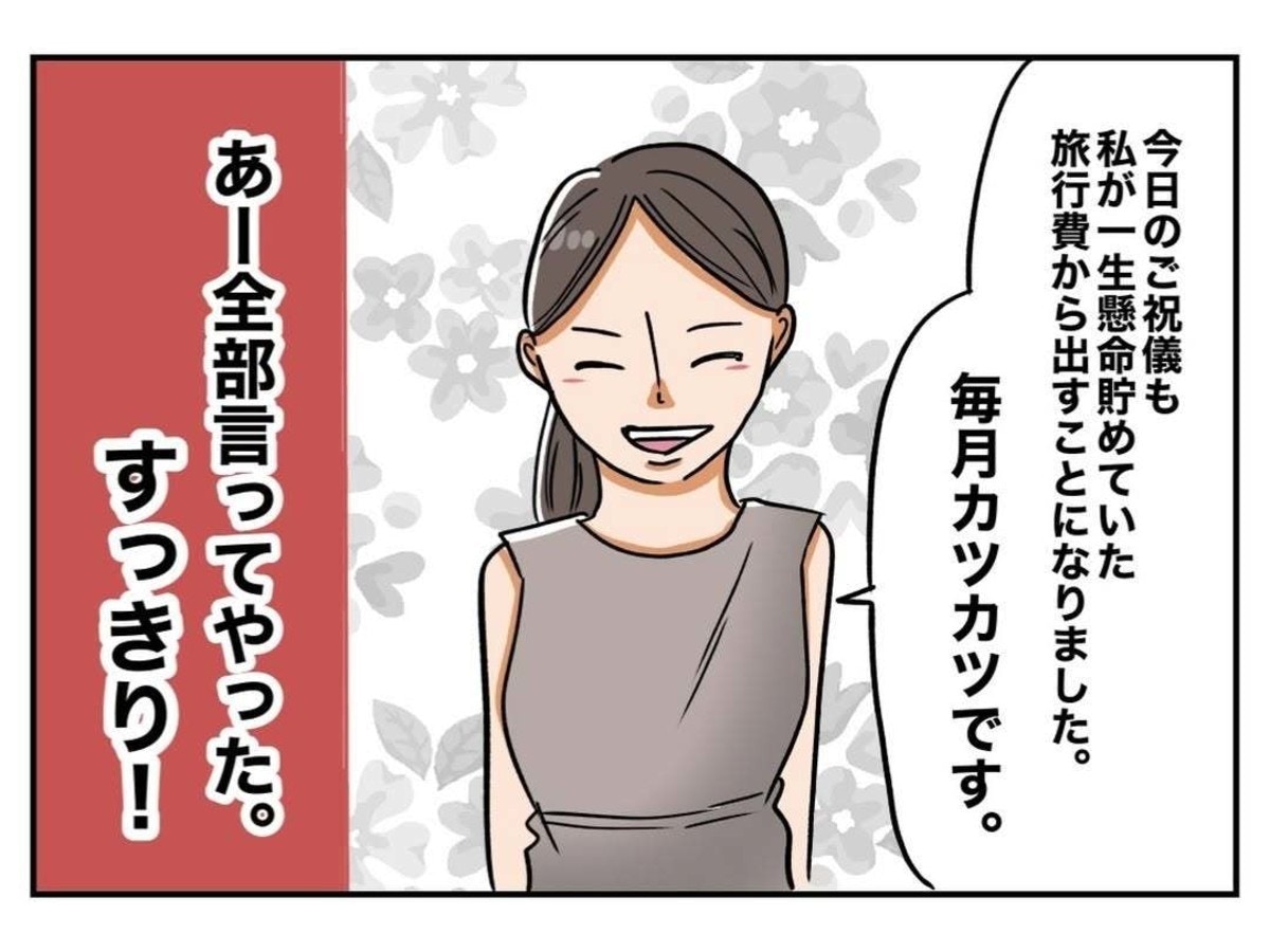 メイカの言う通り、生活がラクではないのは、事実かもしれません。ですが、お祝いの場で、夫に恥をかかせるような発言は、よくなかったですね。