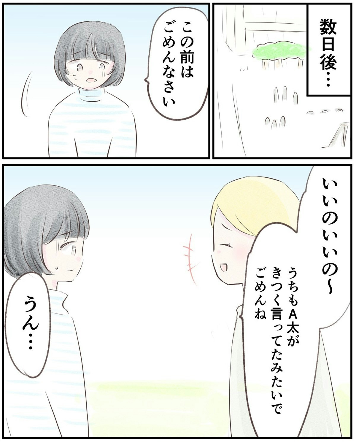 後日マンション内の公園で相川さんと会ったときに、いちかちゃんがA太君を押したことを謝罪した小野さん。相川さんは、笑顔で受け入れてくれてよかったです。