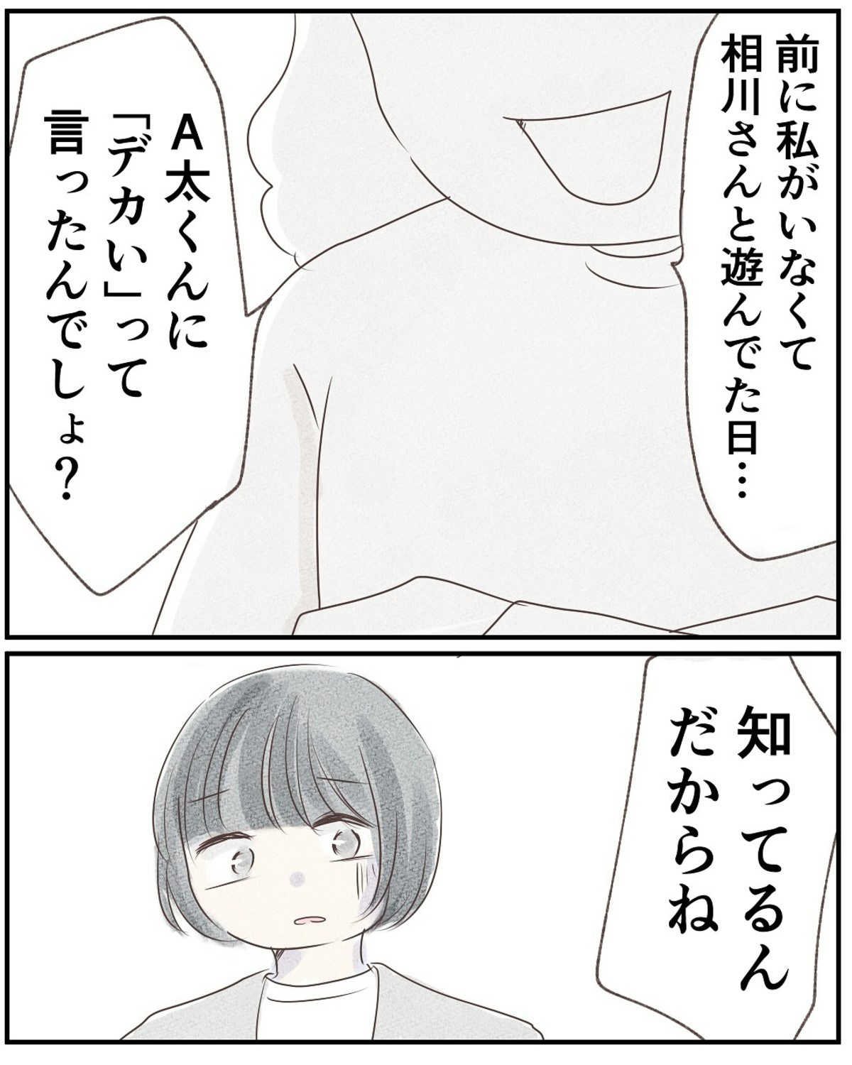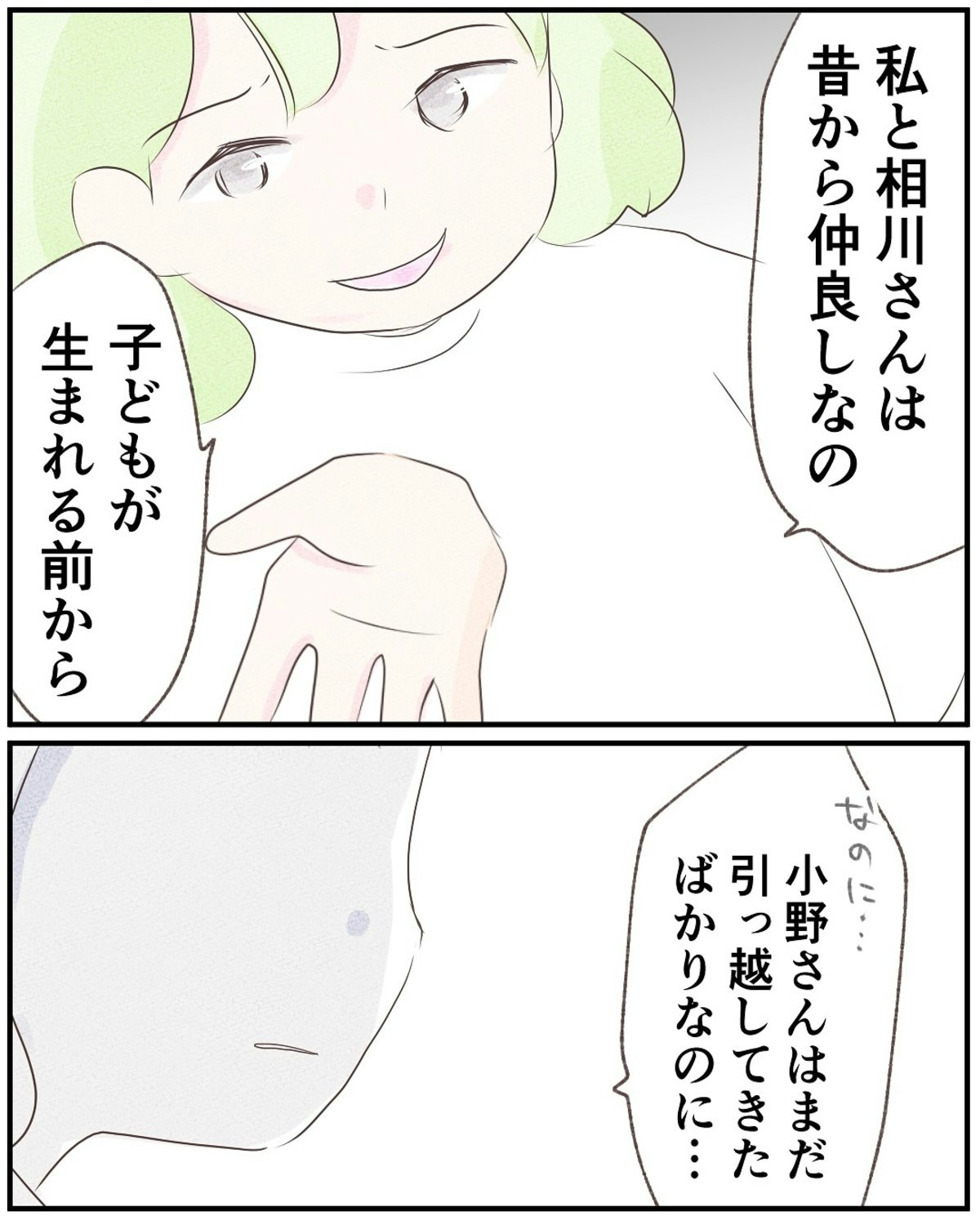 マンションのごみ捨て場へ向かう小野さんは、平田さんに出会います。しかし、挨拶もないどころか素通りされてしまいます。無視されたことに驚いた小野さんは、呼び止めて最近遊べていない理由を問いかけます。すると平田さんは、小野さんの言動が嫌だっと話し始めたのでした。