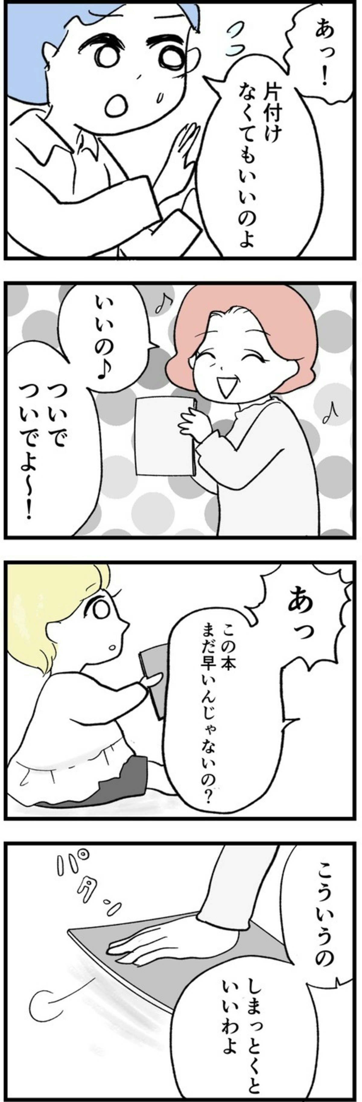まゆさんの制止を振り切り、本棚を勝手に片付け始めた喜美子さん。