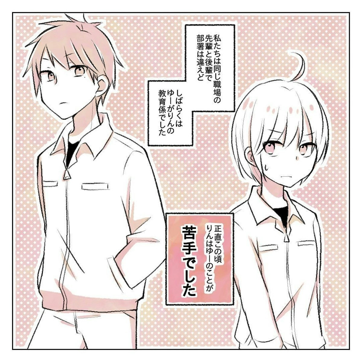 りんさんは、入社当初に教育係をしてくれた先輩・ゆーさんのことが苦手でした。ゆーさんとは年齢は同じとはいえ先輩だという意識もあり、まったく打ち解けることのないまま教育期間は終了。しかしこの後、ゆーさんに誘われた親睦会をきっかけに先輩・後輩の間柄が少しずつ変化していきます。