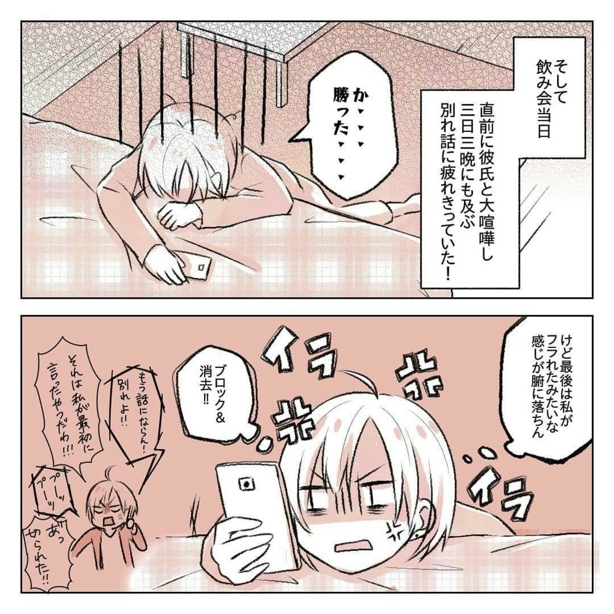 ゆーさんとの飲み会の当日、りんさんは彼氏との別れ話に決着がついたところでした。3日におよぶ死闘を思い出し、りんさんは苛立ちを隠せません。