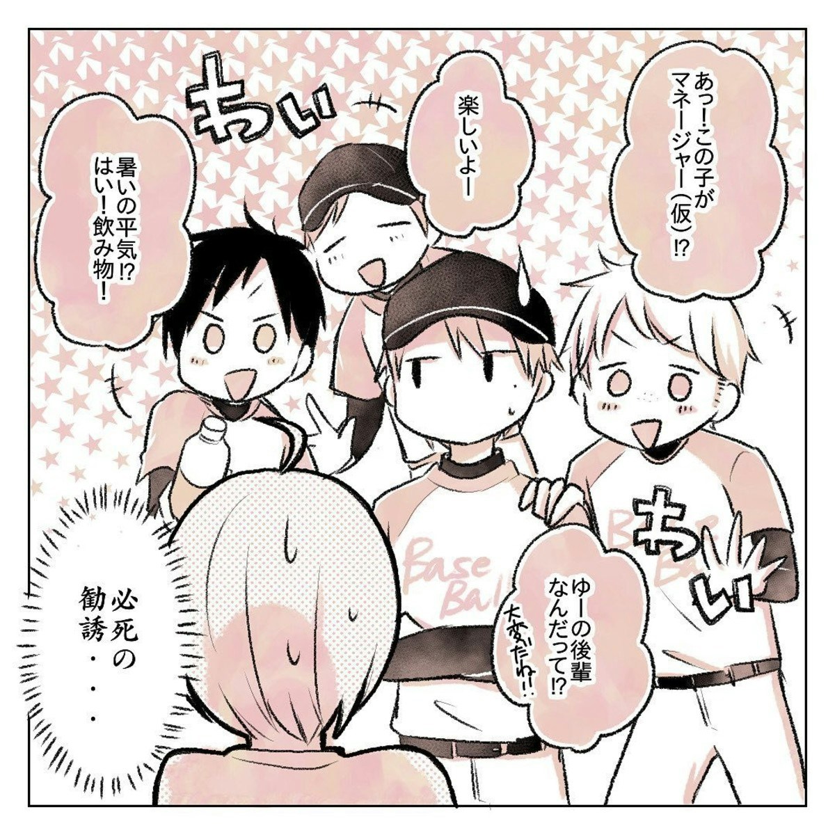ユニフォーム姿のゆーさんと顔を合わせたりんさん。まだやると決めていないのにりんさんを「マネージャー」と呼び、そしてチームメイトたちにも歓迎されます。