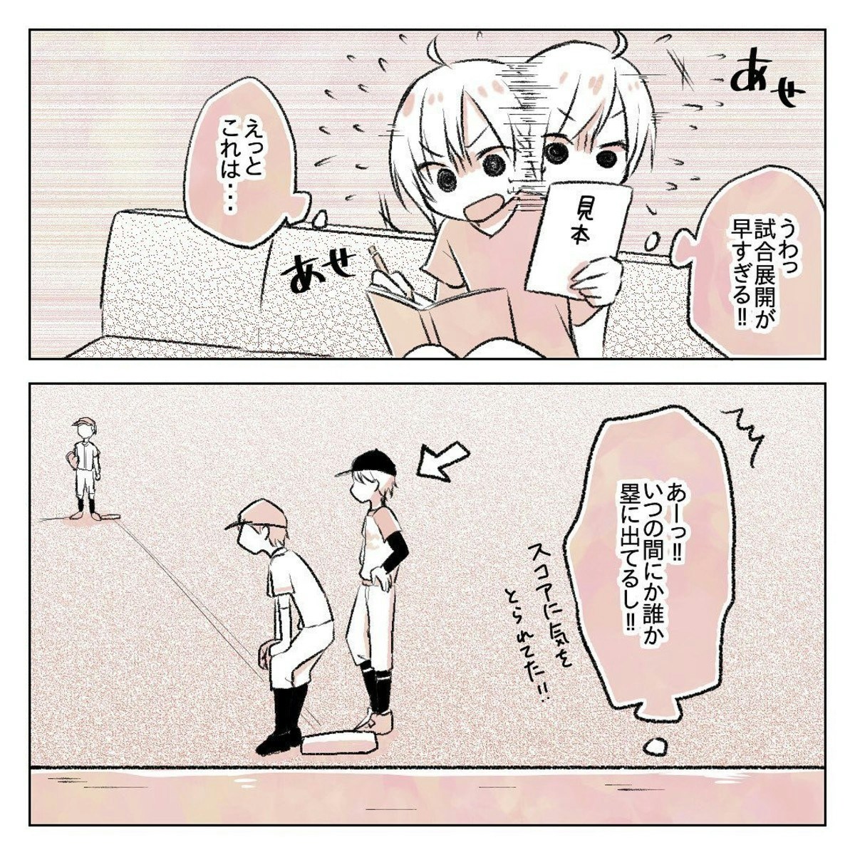 草野球の試合が始まると、りんさんはスコア書きに必死です。試合の流れにもなかなかついていけず、焦ってしまいます。