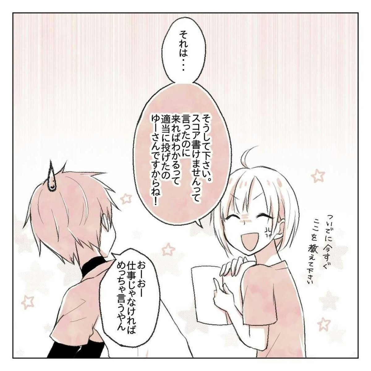 りんさんの遠慮のない言い方に、ゆーさんは楽しそうにいつもの調子で言い返します。仕事に影響がないか心配するりんさんに、ゆーさんは笑いながらも否定してくれました。