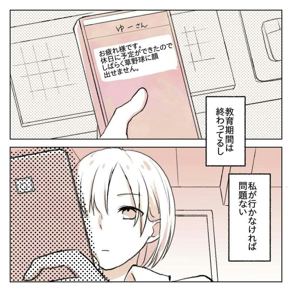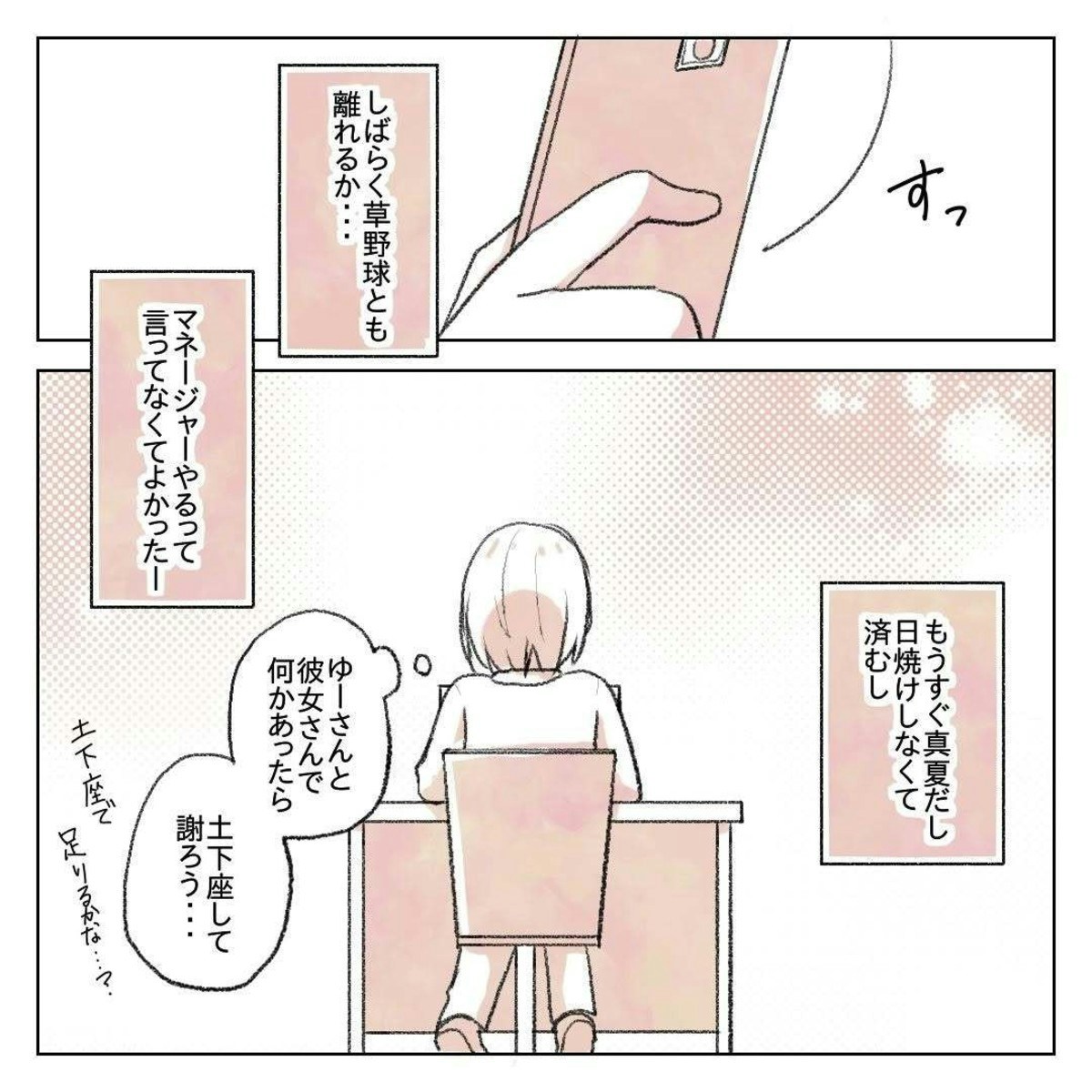思い返してみれば、ゆーさんが「彼女はいない」と言ったときの様子がおかしかったことに気づいたりんさん。そんなゆーさんと距離を置くため、毎週のように顔を出していた草野球にも行かないと決めてしまいます。