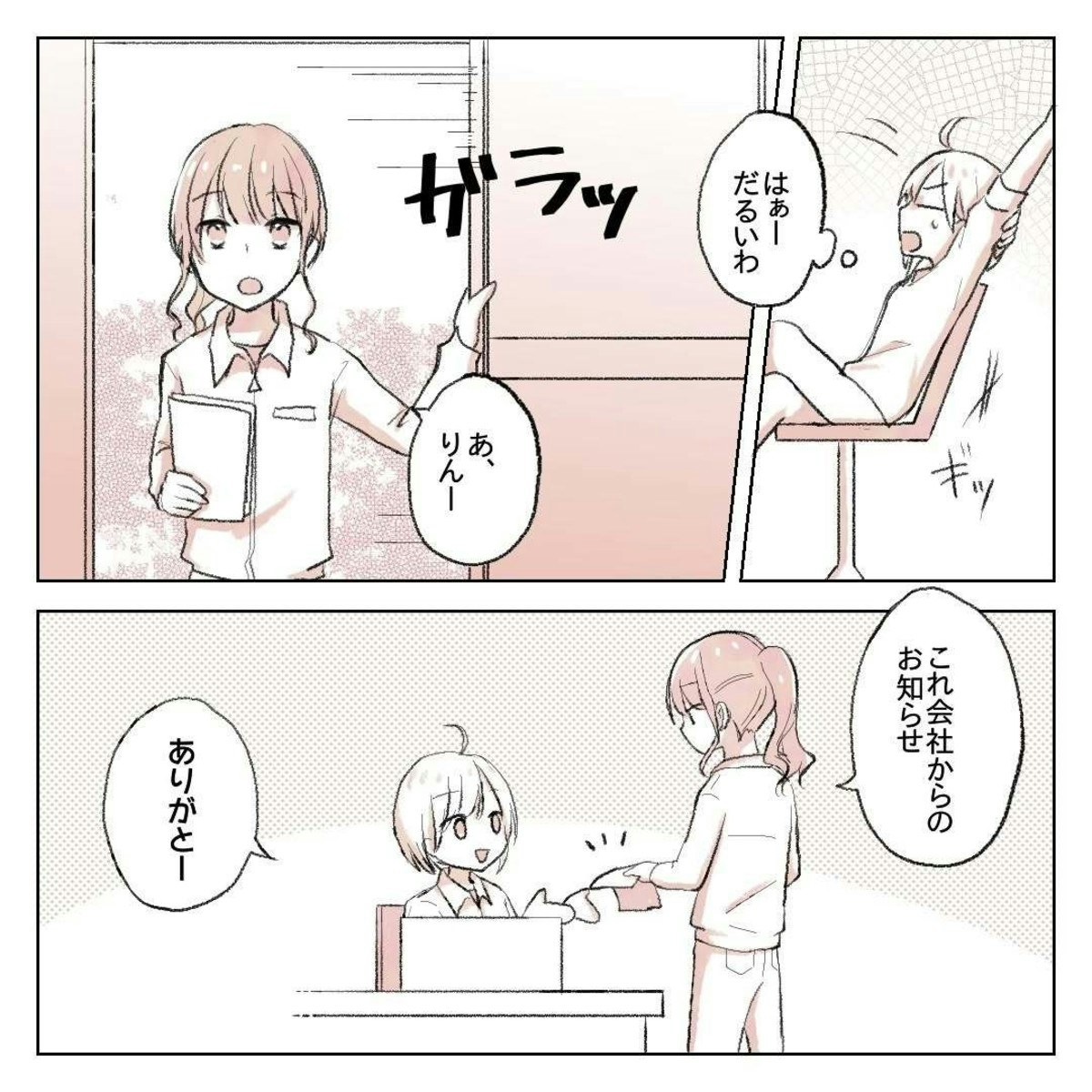 りんさんは、ゆーさんに「しばらく顔を出さない」と連絡を入れました。そこへ、りんさんの同期が会社のお知らせの紙を持ってやって来ました。