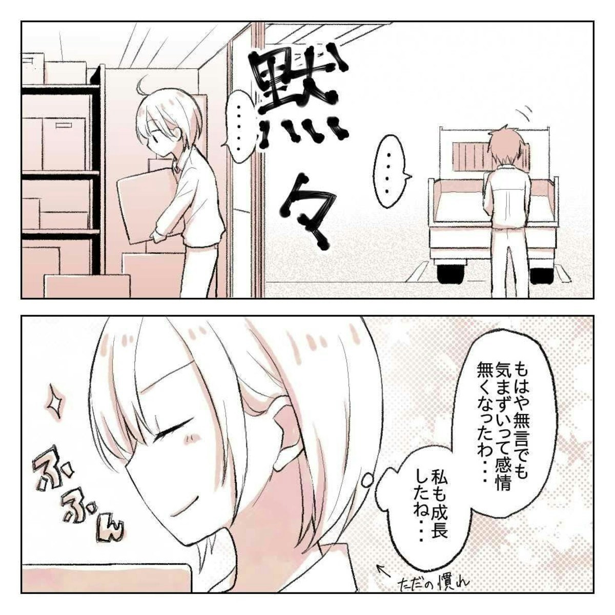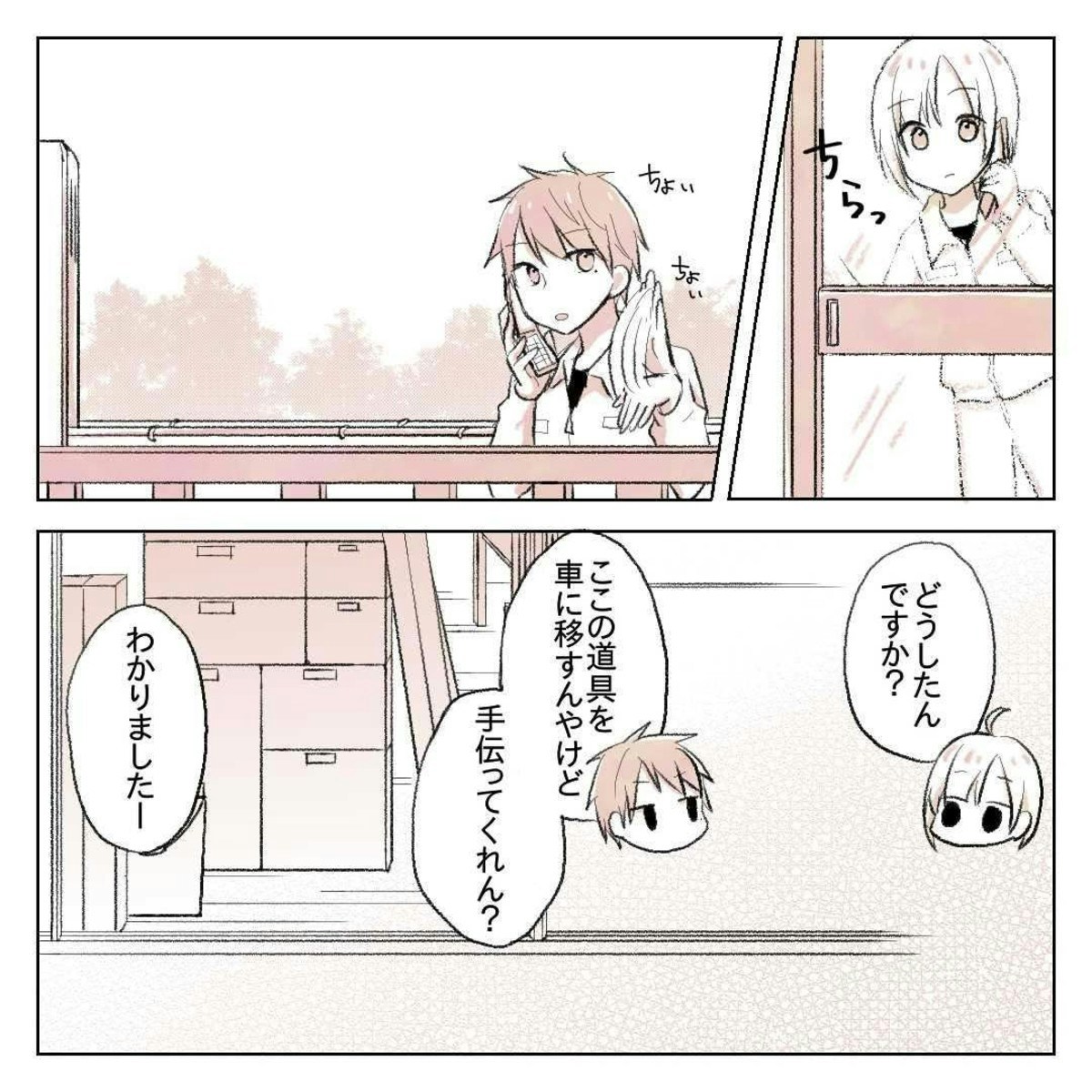 りんさんがゆーさんに呼ばれて外へ出ると、荷物を運ぶのを手伝ってほしいと言われました。りんさんは黙々と仕事をこなし、ゆーさんと会話がなくても気まずい気持ちにならない自分を褒めて余裕の表情です。ゆーさんにこんな態度で接するりんさん、もう彼とは打ち解ける気持ちがないのでしょうか。