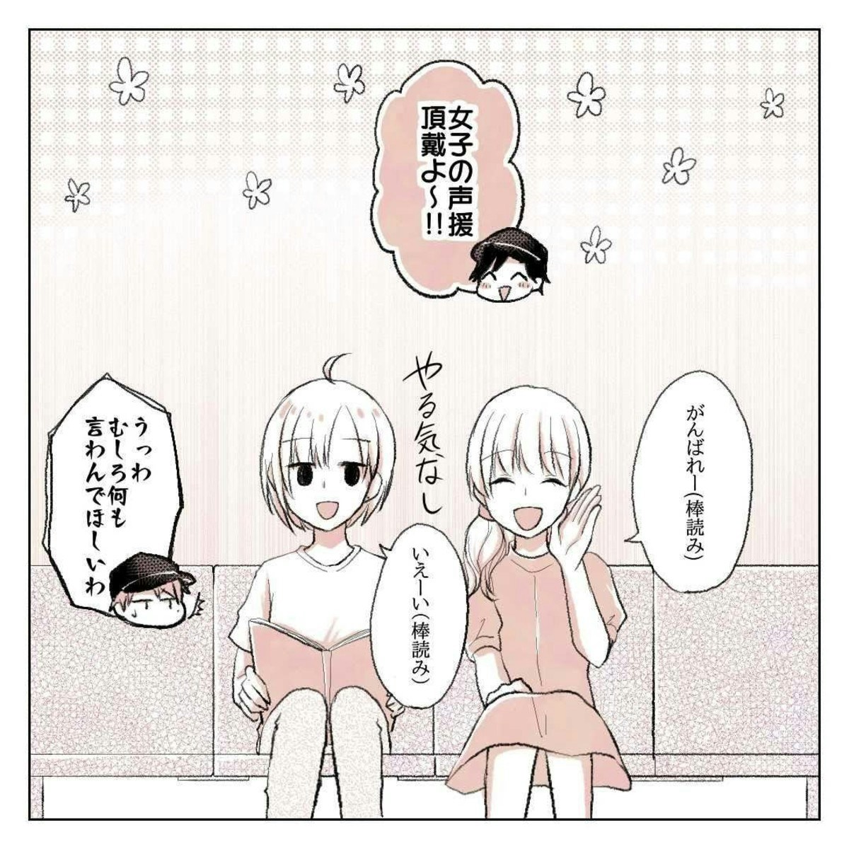 彼女とシゲさんのなれ初めを聞いたりと話がはずむ中で、ベンチに座る女子2人にシゲさんから応援をしてほしいというお願いが。