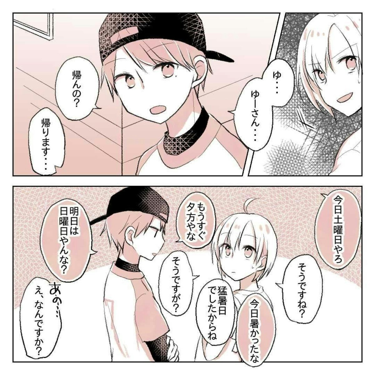 りんさんは、入社当初に教育係をしてくれた先輩・ゆーさんのことが苦手でした。ゆーさんとは年齢は同じとはいえ先輩だという意識もあり、まったく打ち解けることのないまま教育期間は終了。しかしこの後、ゆーさんに誘われた親睦会をきっかけに先輩・後輩の間柄が少しずつ変化していきます。