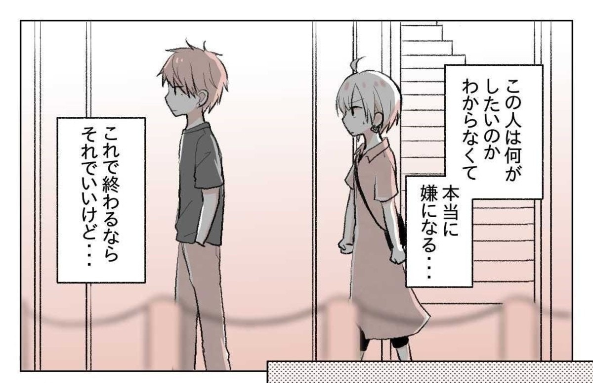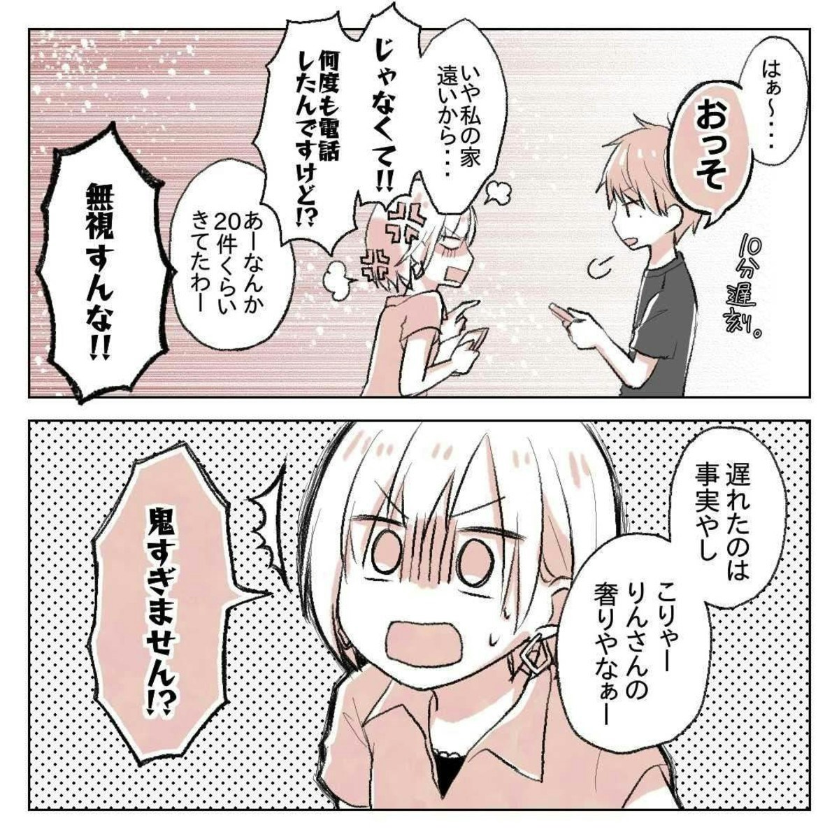りんさんは、ゆーさんとの待ち合わせに10分遅刻して到着します。断りの電話を何度もしたと怒ってみても、ゆーさんには伝わっていない様子。こんな彼の気持ちが全くわからないりんさんは、彼女持ちの先輩との付き合いもこれで終わるならと思い始めます。