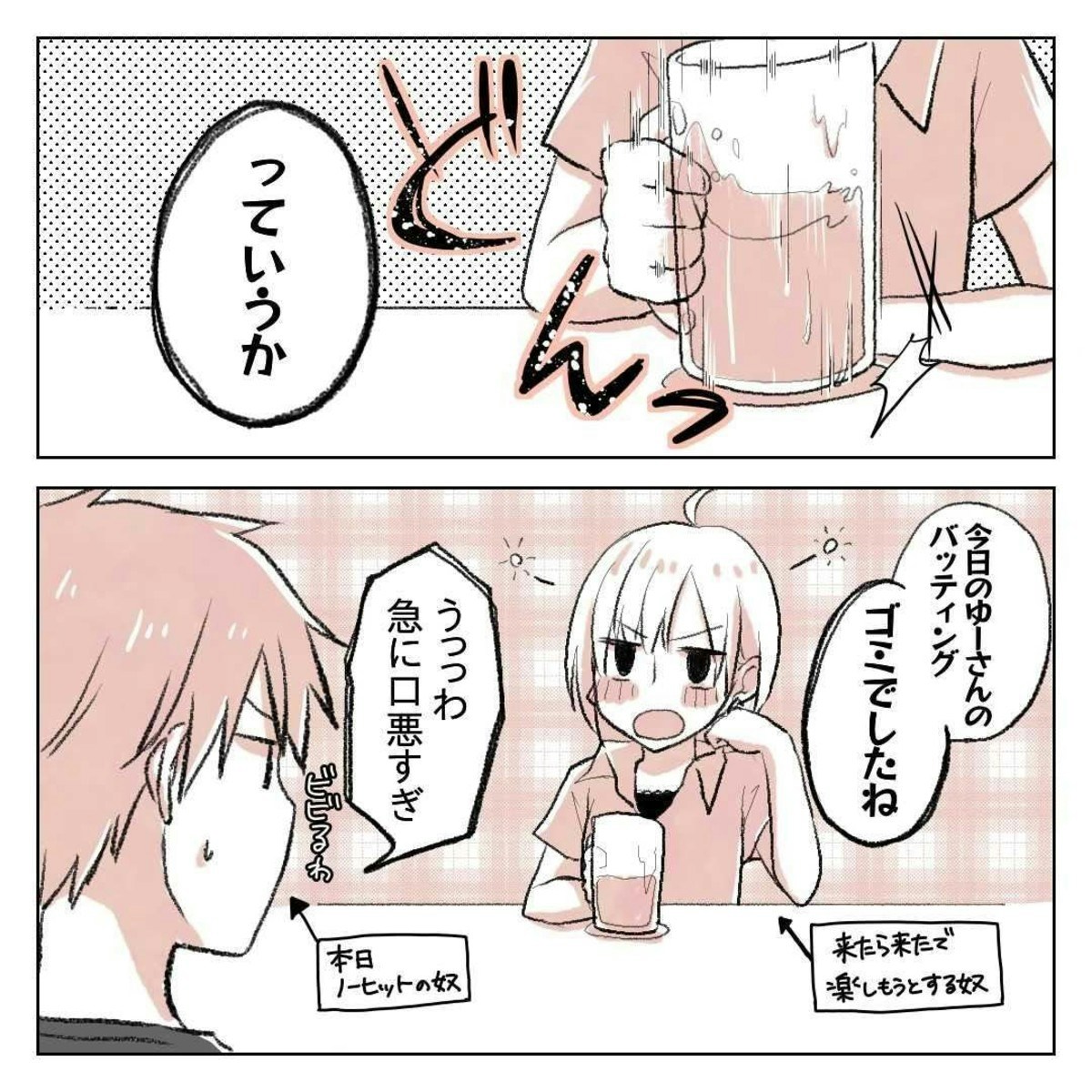 りんさんは、ゆーさんの強引な誘いもこれで終わるならと心の中で思っていました。すっかり酔っ払ってゆーさんにも遠慮なしに今日の試合のダメ出しを始めたりんさん、言われた本人も驚くほど言いたいことを口にしています。りんさんは、せっかく来たから思っていることを言って終わりにしようとしているのでしょうか。