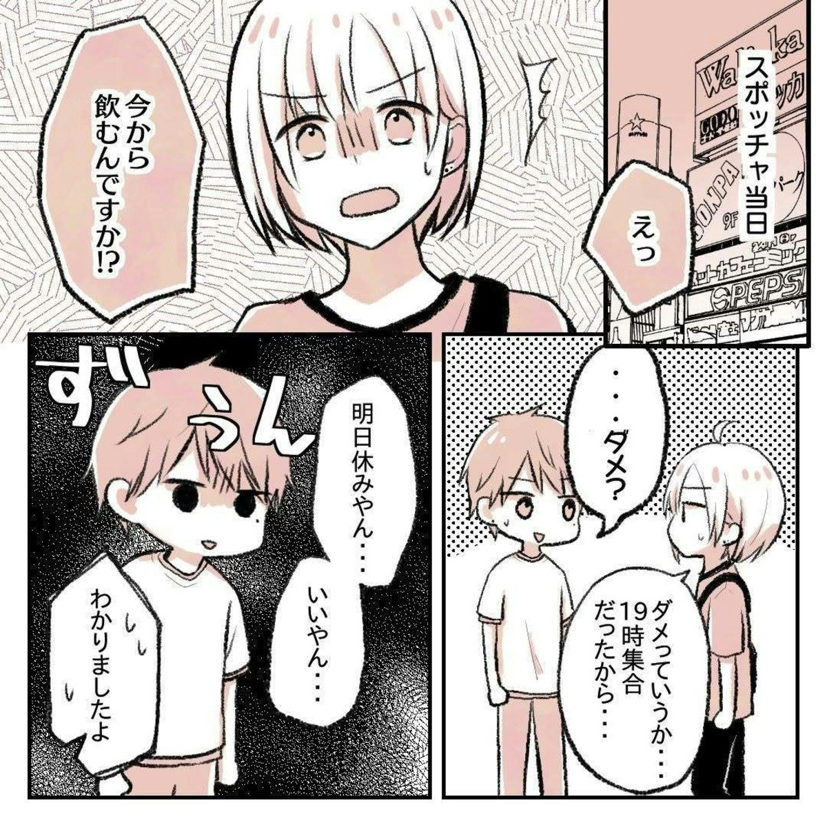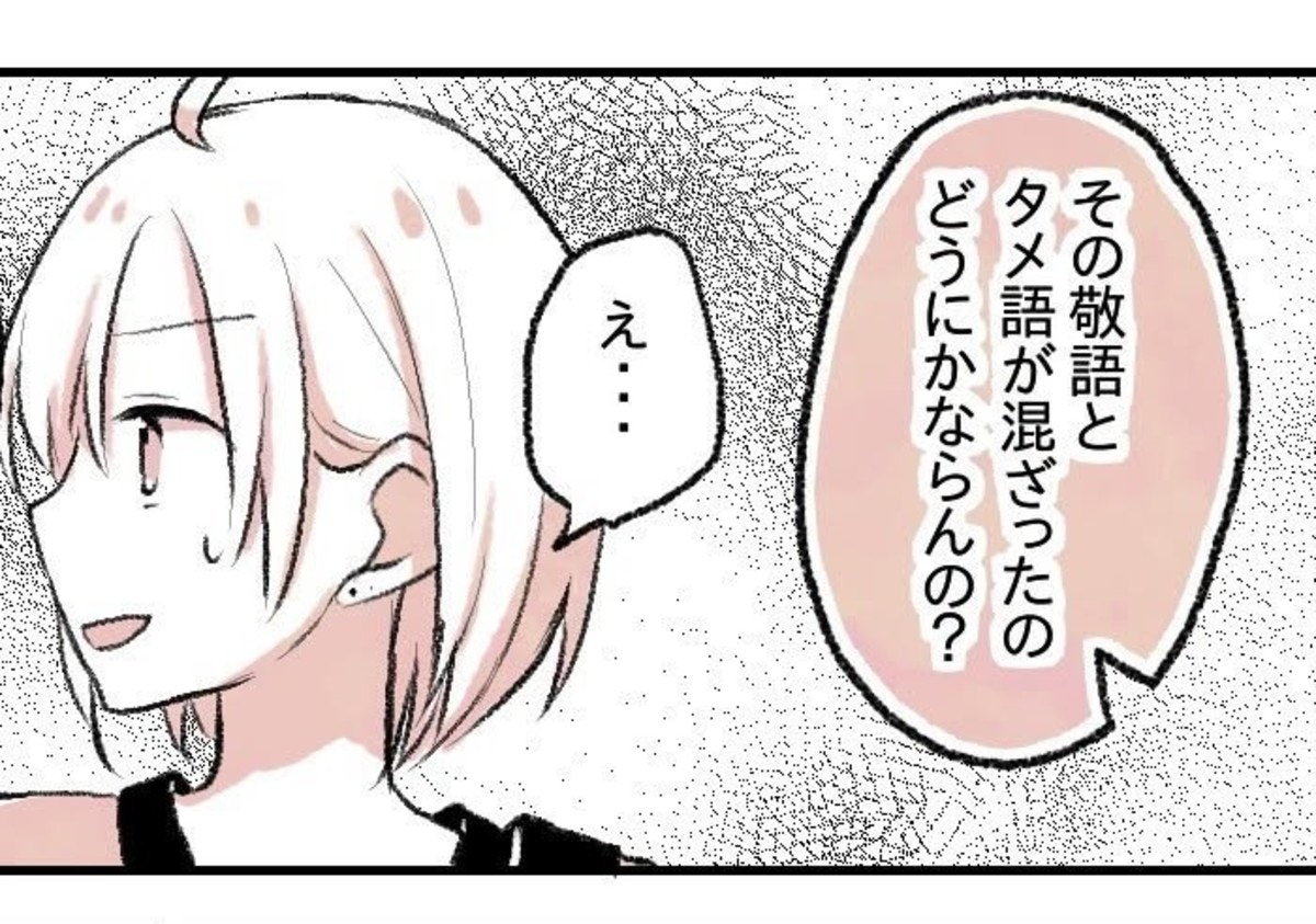 ゆーさんと遊ぶ約束をした当日、まずは飲むことになりお店へ向かいます。その道中の会話で、ゆーさんはりんさんの敬語とタメ語が混ざった話し方が気になると言い始めます。