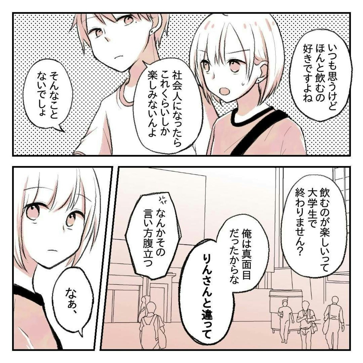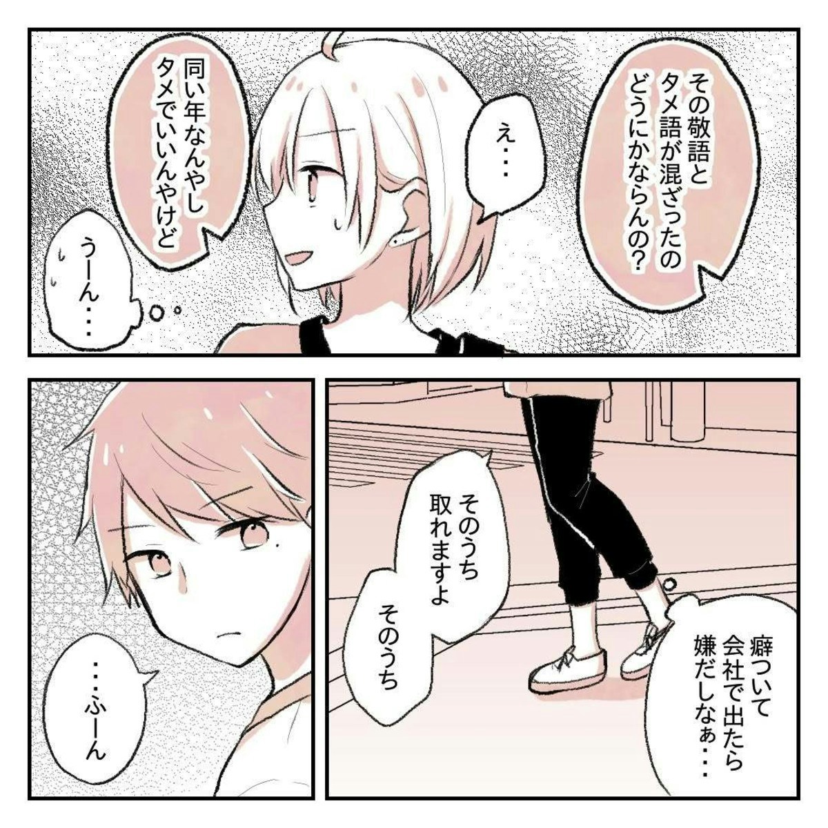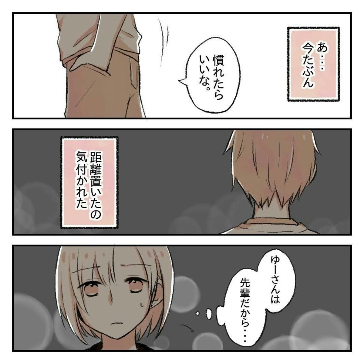 ゆーさんは、りんさんの敬語に距離を感じていたようです。ゆーさんとしては、会社の外で話すときくらいはと思っているのかもしれませんが、りんさんはそんなわけにはいかず複雑な気持ちになってしまいます。